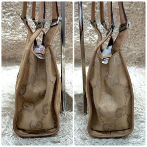 This Gucci shoulder bag features the iconic beige GG monogram canvas with tan leather trim and silver-tone hardware. It offers a stylish and practical design with dual handles for comfortable carrying.