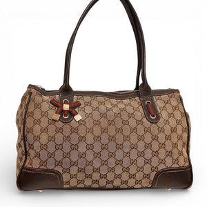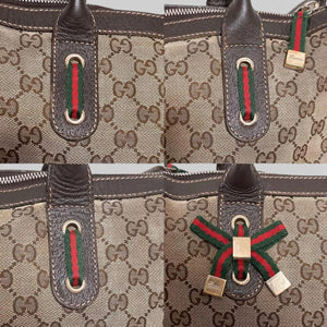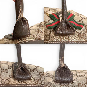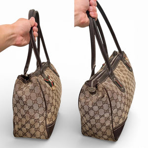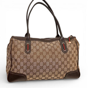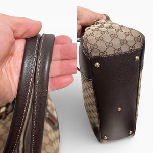 This Gucci handbag features the iconic GG canvas pattern with brown leather trim and double shoulder straps. It has a zippered top closure and decorative green and red ribbon detail with gold-tone hardware.