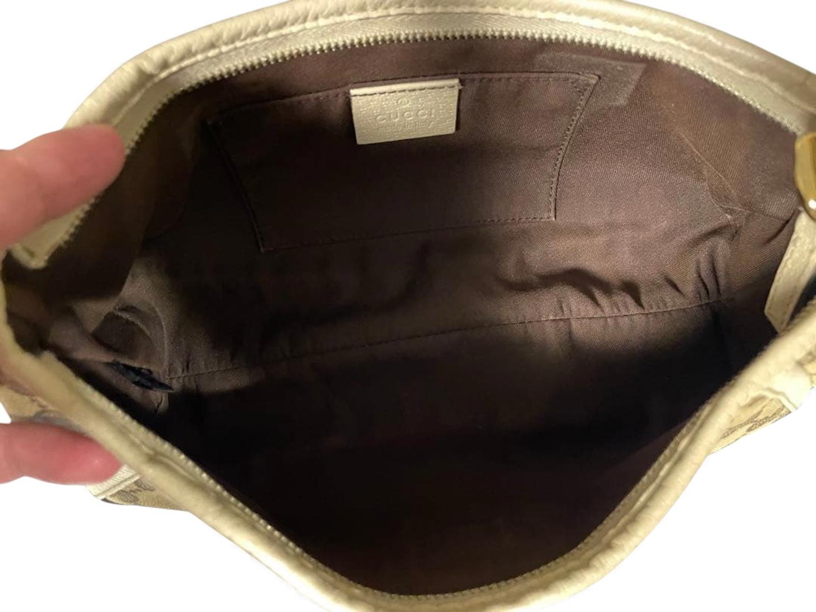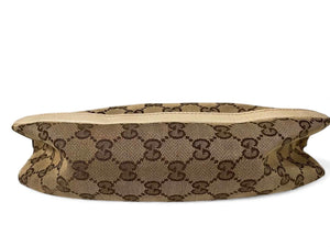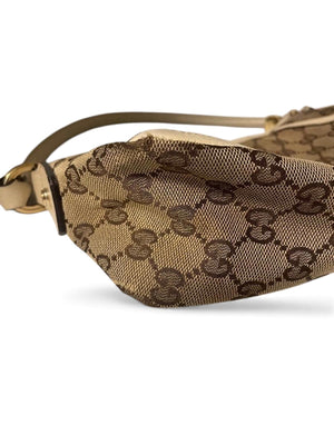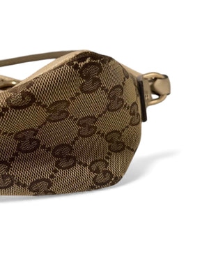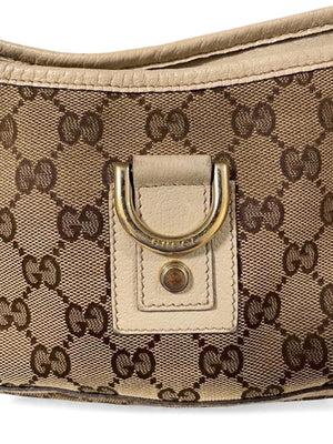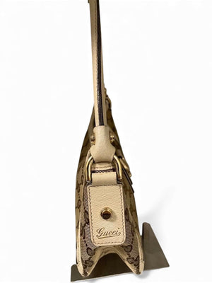 This Gucci women's shoulder bag features the iconic GG monogram canvas with beige leather trim and gold-tone hardware. It offers a compact and stylish design perfect for everyday use or special occasions.