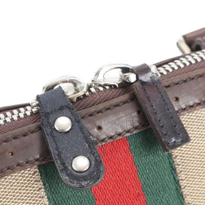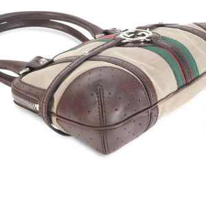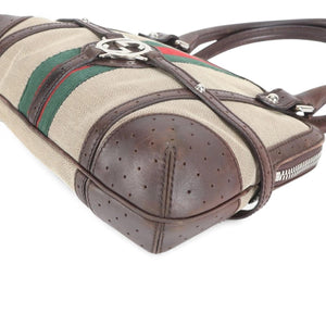 This vintage Gucci handbag features a distinctive combination of brown perforated leather and beige canvas accented with the iconic green and red stripe. It has a structured silhouette with dual handles and a silver-tone logo emblem at the front. The interior is lined and includes a leather Gucci label stamped "made in Italy." A timeless accessory for everyday use or special occasions.