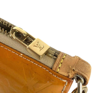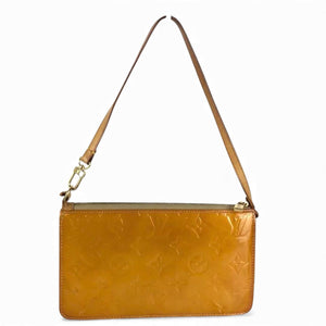 This Louis Vuitton women's shoulder bag is crafted from signature monogram Vernis leather in a warm caramel colour. It features a sleek rectangular silhouette with a single adjustable shoulder strap and gold-tone hardware. The bag is secured with a top zip closure and offers a compact yet practical space for essentials.