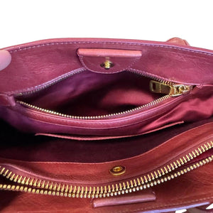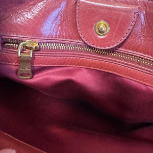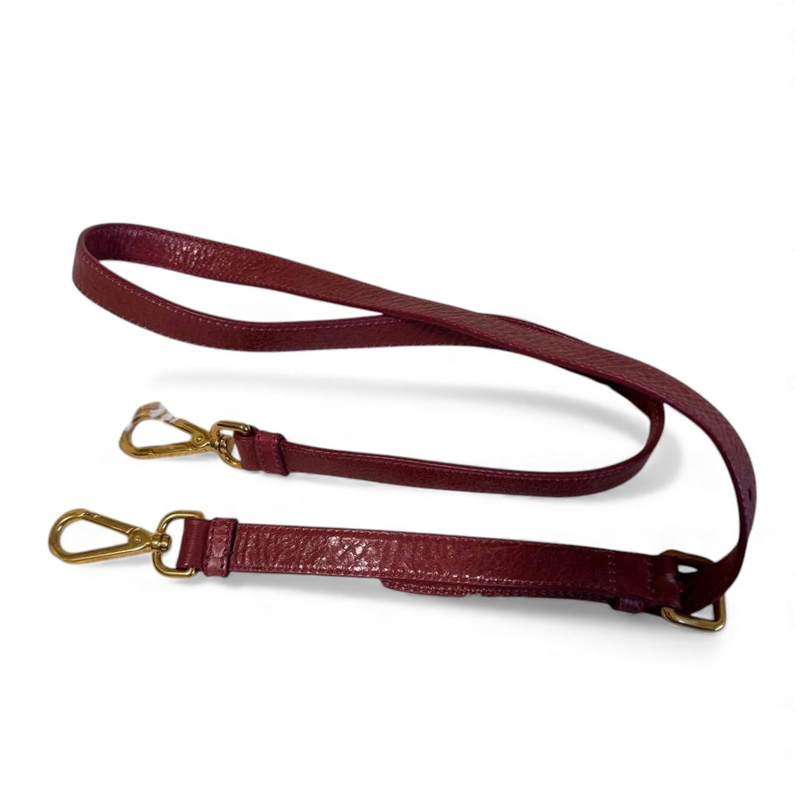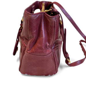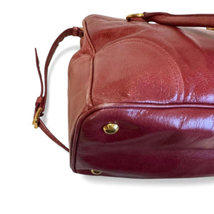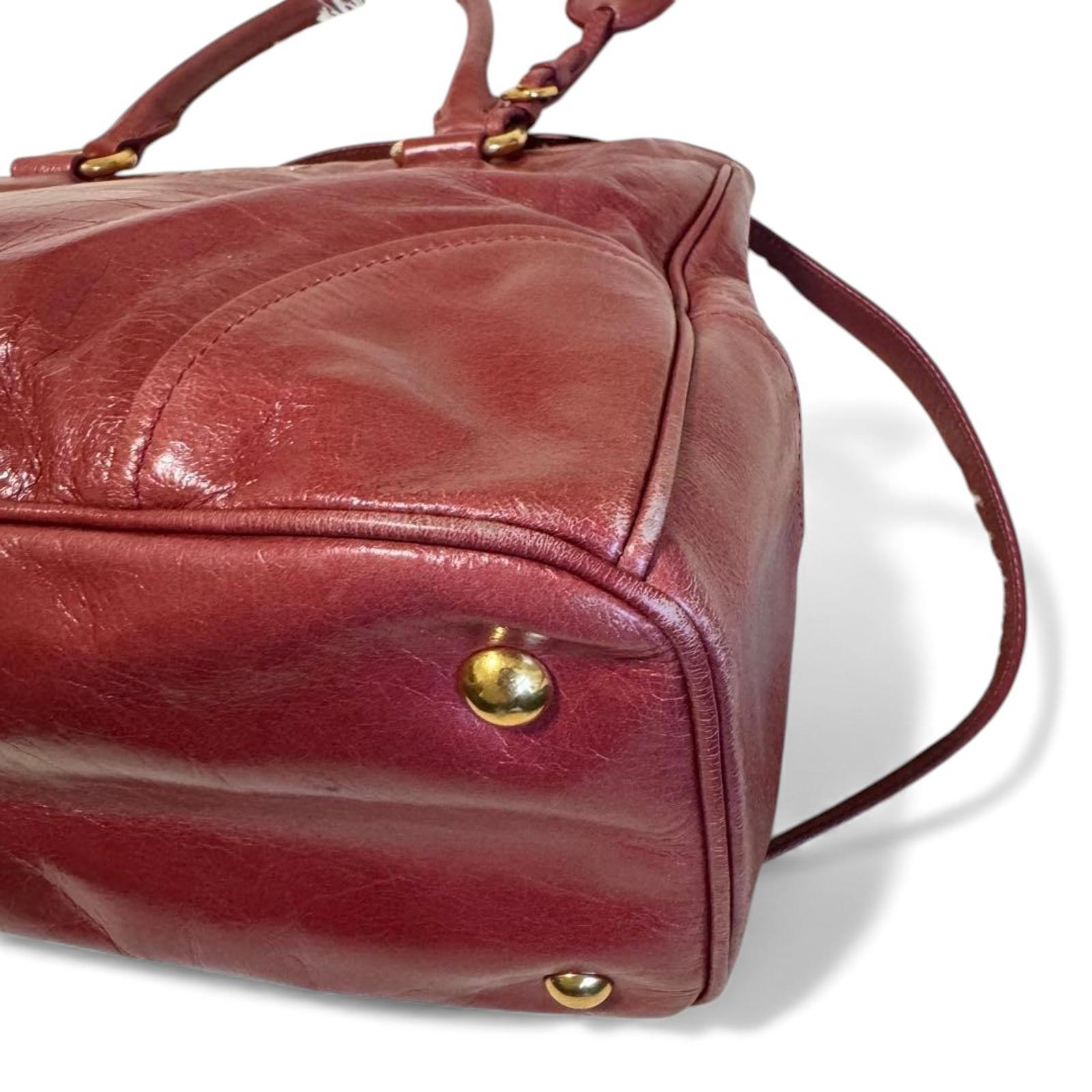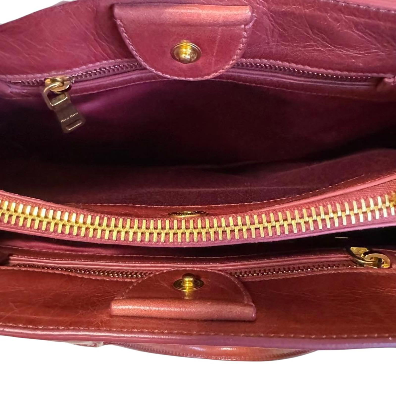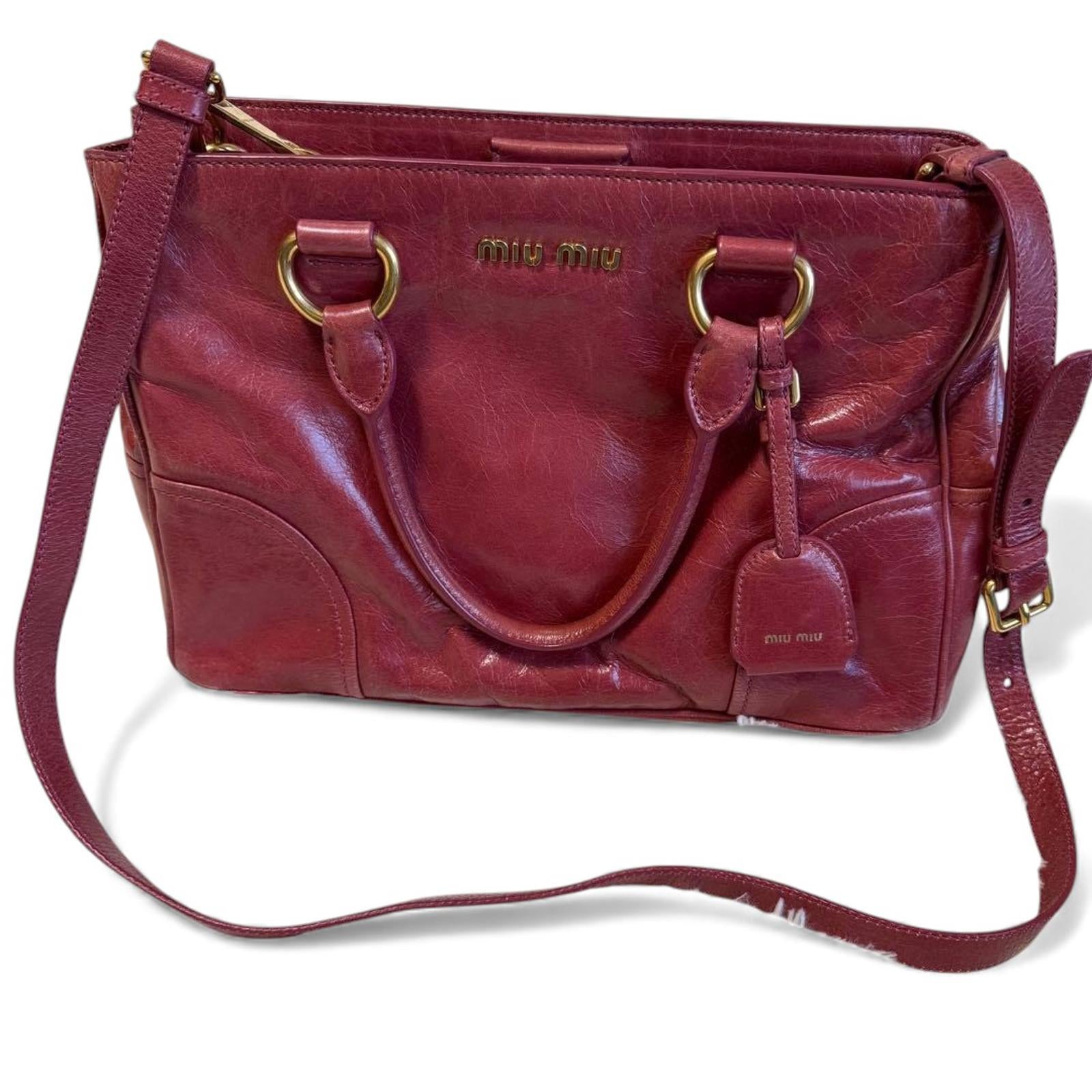 This Miu Miu handbag is crafted from burgundy leather with gold-tone hardware. It features dual handles and a detachable shoulder strap for versatile carrying options. The interior is lined with fabric and includes zippered compartments for organisation.
