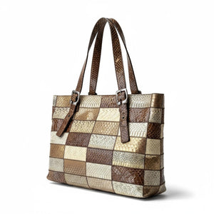 This tote bag features a distinctive patchwork design made from various shades of brown and cream leather with a textured, almost snakeskin-like finish. It offers a spacious interior perfect for daily essentials or work items, with sturdy double straps secured by buckles for comfortable carrying.