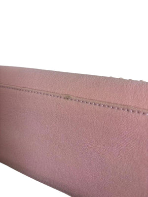 This Miu Miu handbag features a sleek rectangular silhouette crafted from soft pink leather. It has dual rounded handles and a zip-top closure, perfect for daily use or special occasions. The bag is embossed with the Miu Miu logo on the front, adding a subtle designer touch.