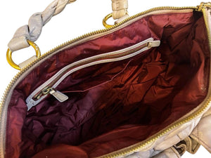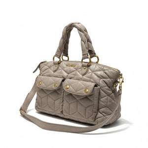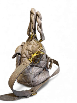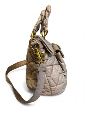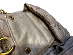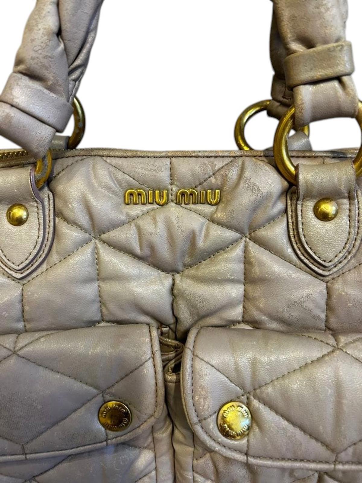 This Miu Miu shoulder bag features a quilted leather design in a neutral beige tone, complemented by gold-tone hardware. It includes two spacious front pouches with button closures and a detachable shoulder strap for versatile carrying options. The bag is crafted with soft, padded leather, offering both style and function.
