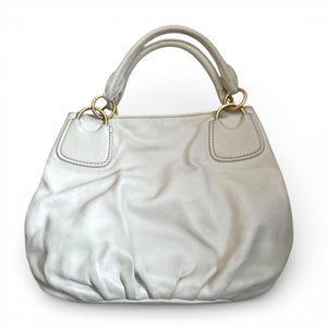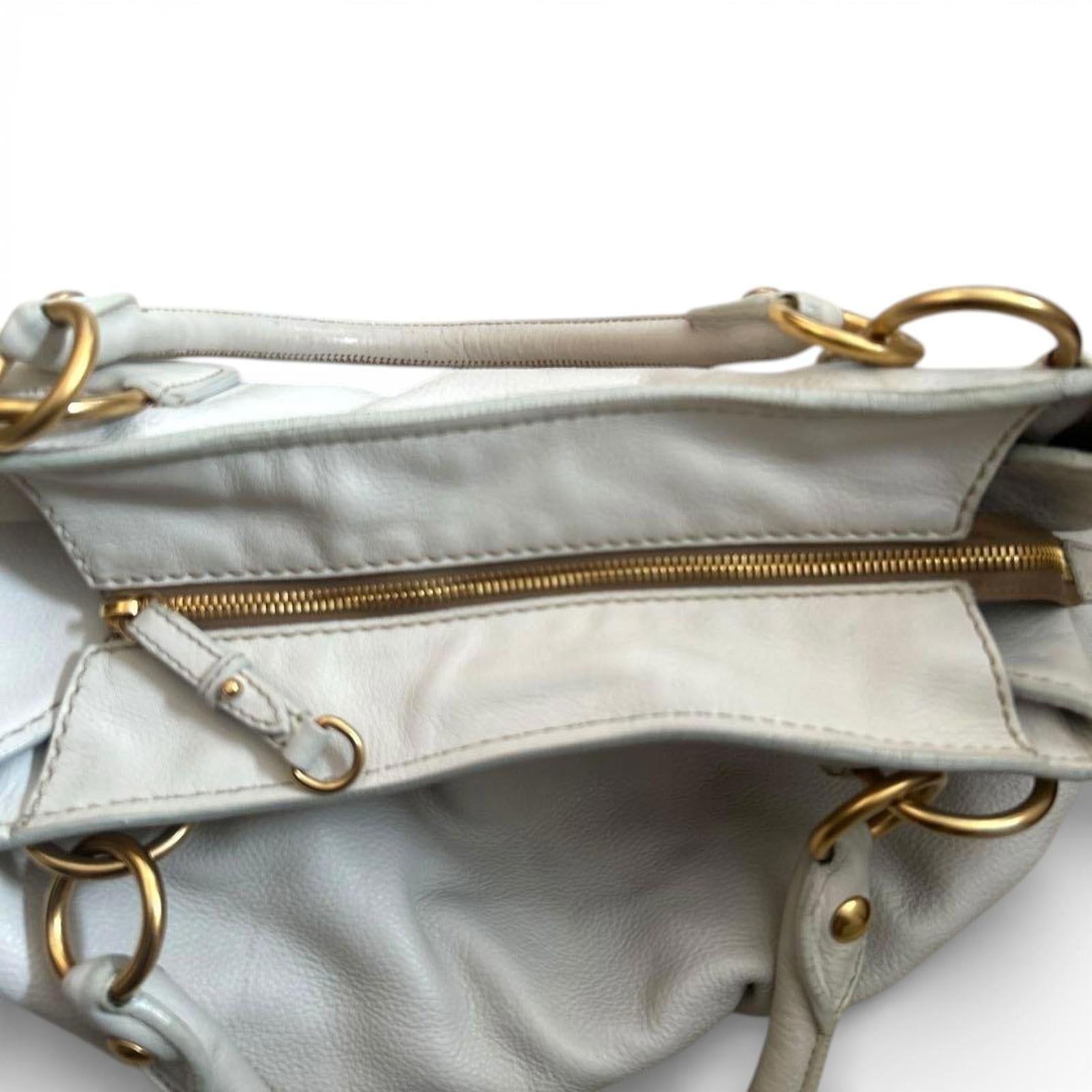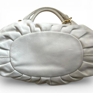 This Miu Miu shoulder bag is crafted from white leather with gold-tone hardware. It features a spacious interior and a comfortable double handle for easy carrying. The bag has a soft, gathered design at the base, adding a subtle stylish touch.