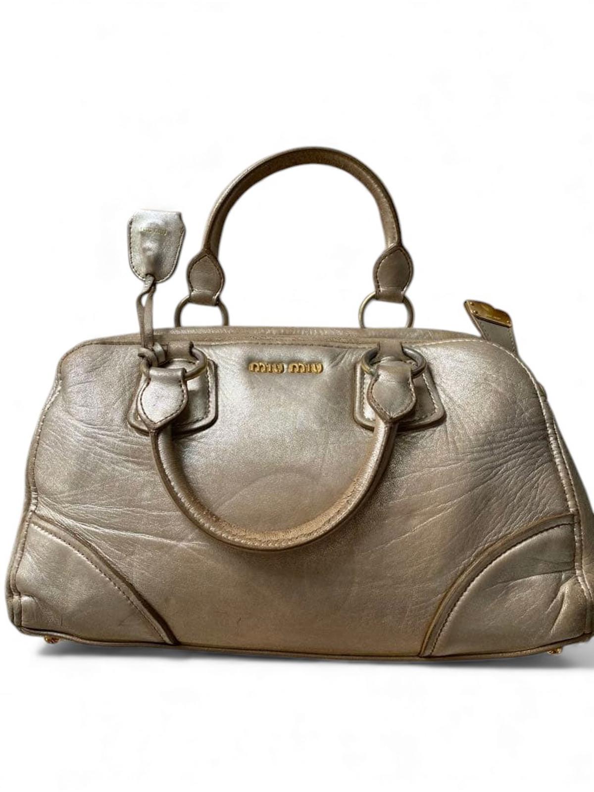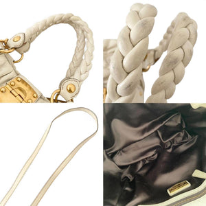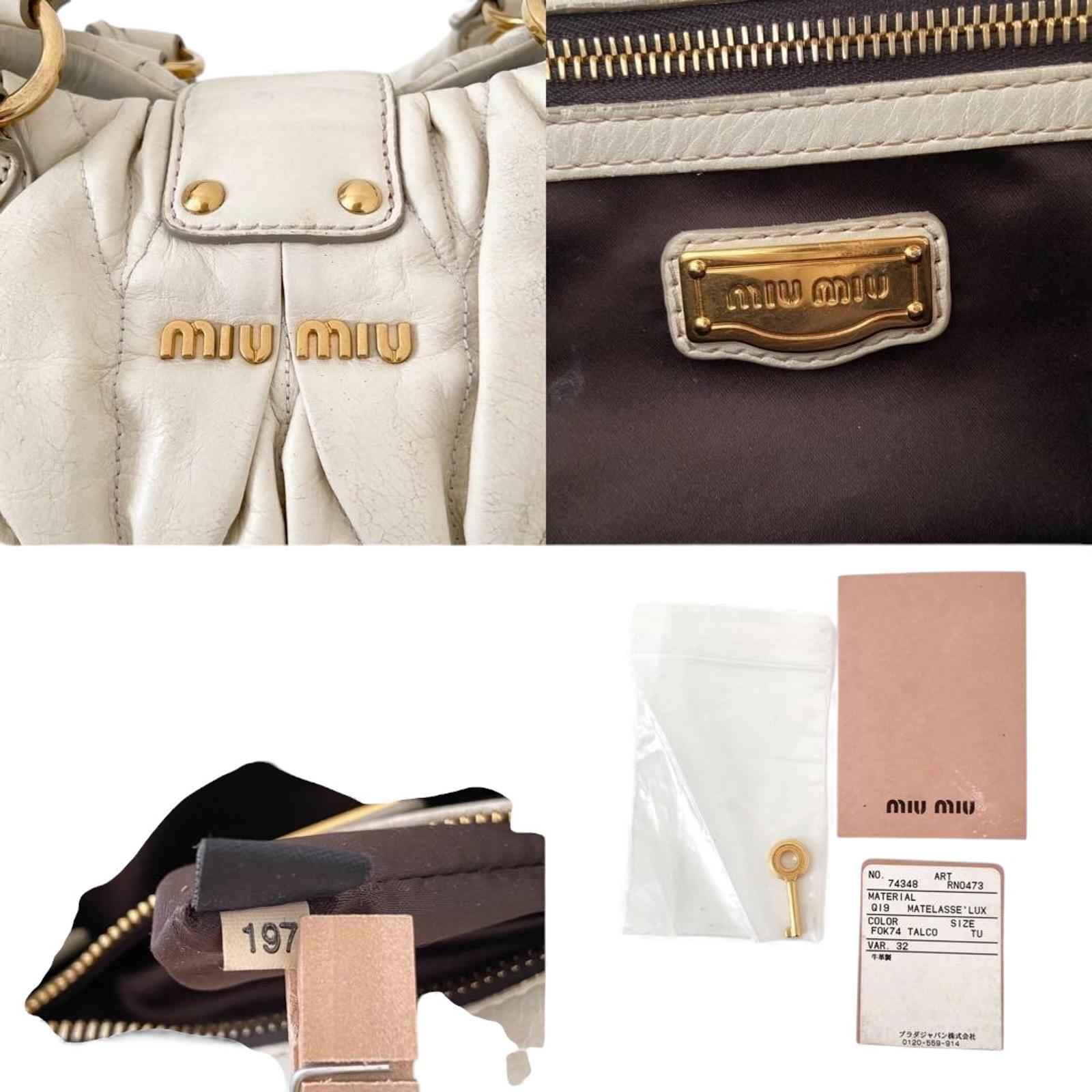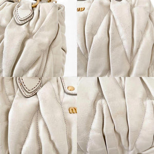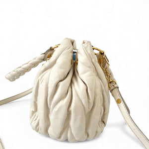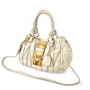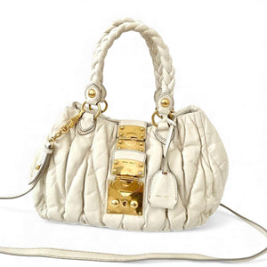 This elegant Miu Miu shoulder bag features a soft white leather exterior with distinctive quilted detailing and a striking gold-tone buckle closure. It includes braided leather handles and a detachable shoulder strap for versatile wear. The interior is lined with dark fabric and has a zip pocket, perfect for organising essentials.