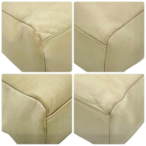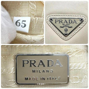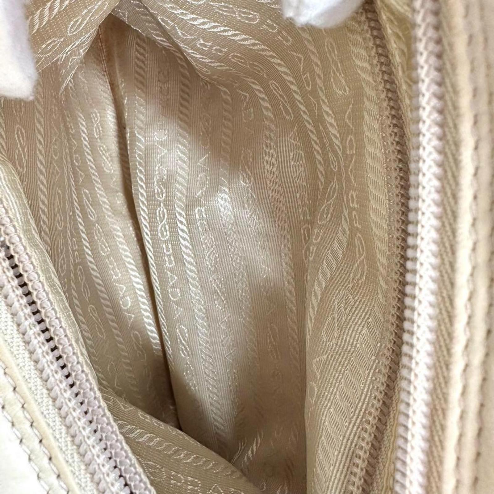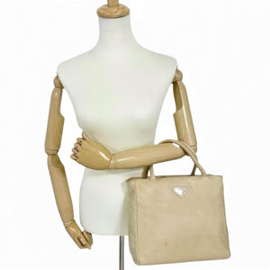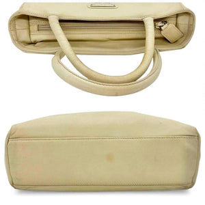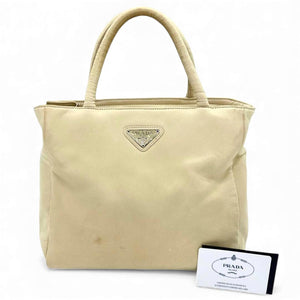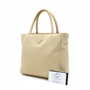 This Prada tote bag is crafted from beige nylon, featuring a clean, minimalist design with the iconic Prada triangle logo on the front. It offers a spacious interior perfect for everyday use or work essentials, complemented by sturdy double handles for comfortable carrying.