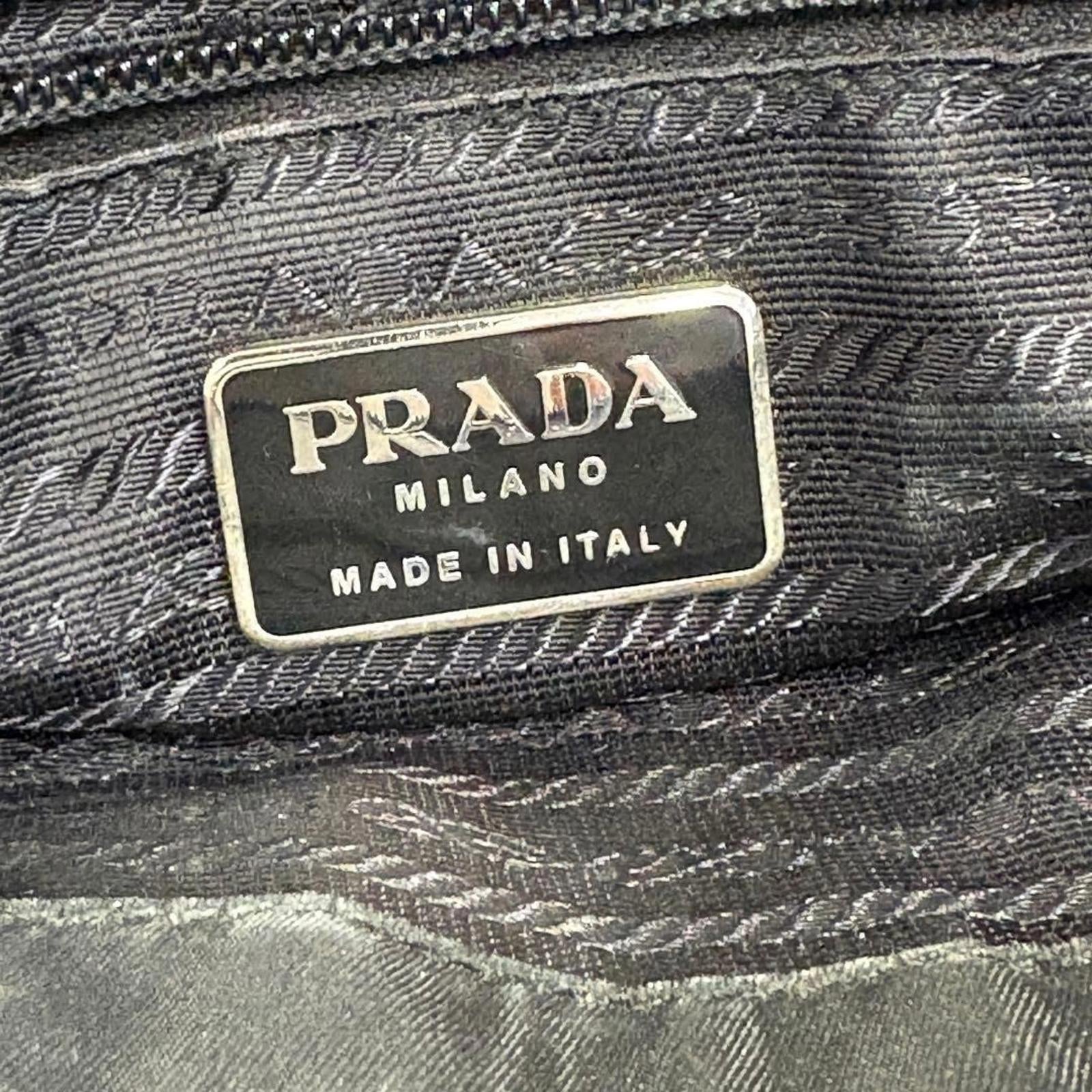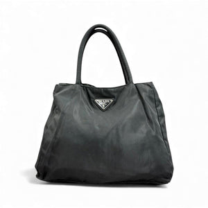 This Prada handbag features a sleek black nylon exterior with the iconic Prada logo plaque on the front. It offers a spacious interior perfect for everyday use, combining practicality with luxury.