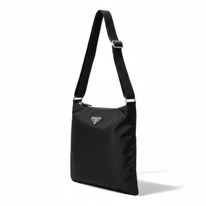 This Prada men's shoulder bag is crafted from durable black nylon with an adjustable strap for comfortable wear. It features a zip closure and the iconic Prada triangle logo on the front, combining practicality with luxury.
