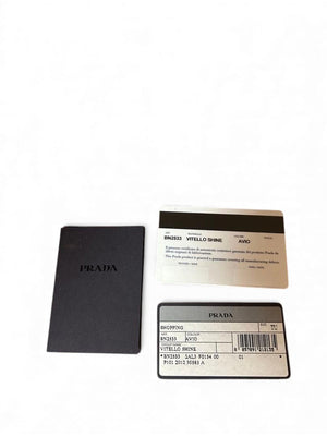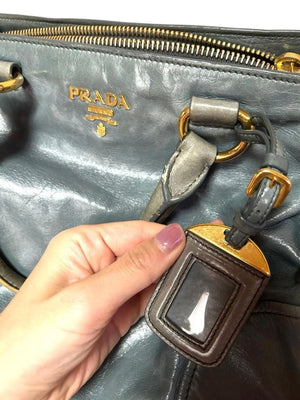 This Prada handbag features a smooth blue leather exterior accented with gold-tone hardware. It includes sturdy double handles, a zip-top closure, and a stylish luggage tag. The bag combines elegance and practicality, suitable for everyday use or special occasions.