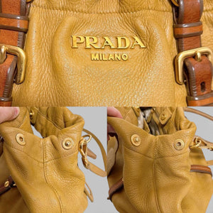 This Prada handbag features a soft yellow leather body with contrasting brown leather straps and gold-tone hardware. It has a spacious interior with a drawstring closure and snap buttons for added security. The bag includes a detachable shoulder strap for versatile carrying options.
