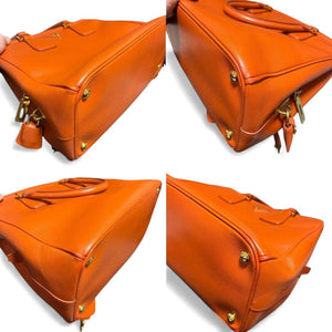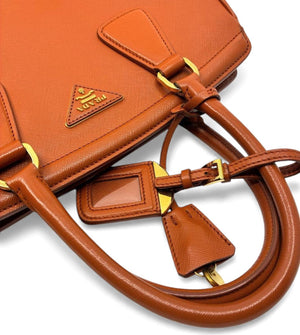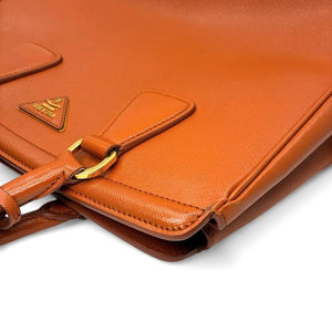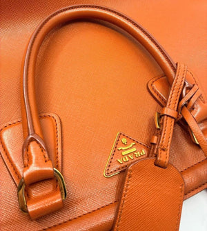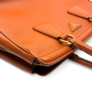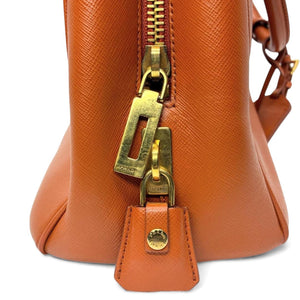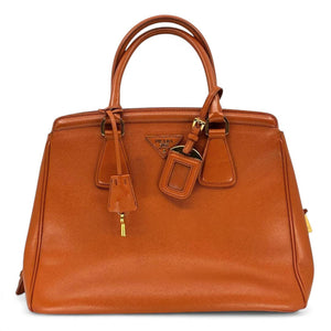 This Prada handbag is crafted from high-quality brown leather, featuring a structured silhouette with dual handles and gold-tone hardware accents. It includes a zip closure on the side and a distinctive Prada logo plaque, making it a timeless accessory for everyday use or special occasions.