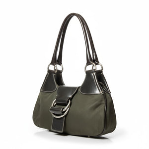 This Prada women's handbag features a stylish olive green fabric body complemented by dark brown leather accents and handles. The front buckle detail adds a modern touch to this shoulder bag, making it both fashionable and functional for everyday use.