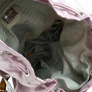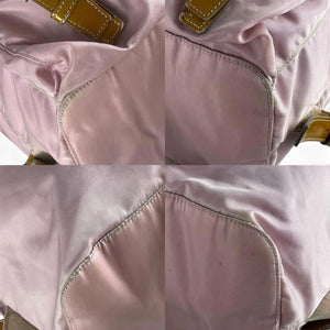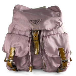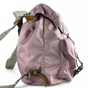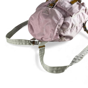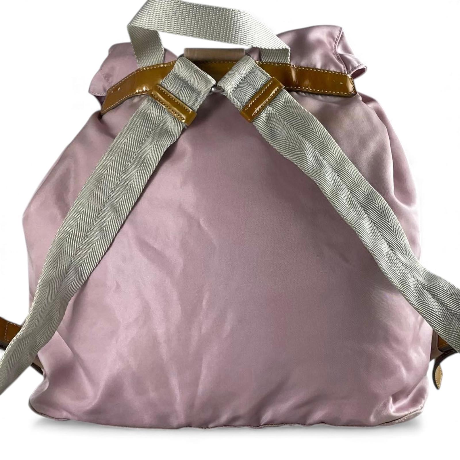 This Prada backpack features a soft pink nylon body complemented by tan leather straps and buckle details. It offers a spacious main compartment with a flap closure and additional front pockets, making it both stylish and functional for daily use.