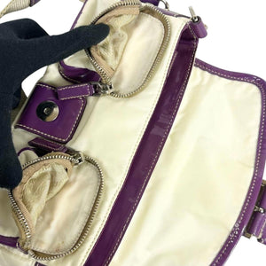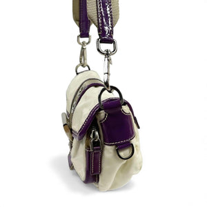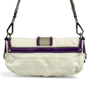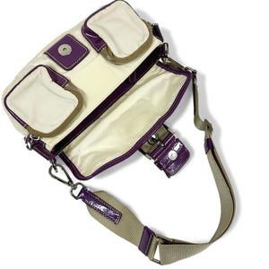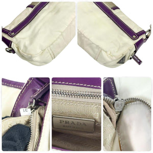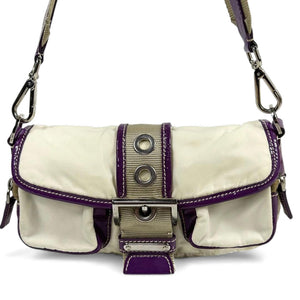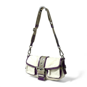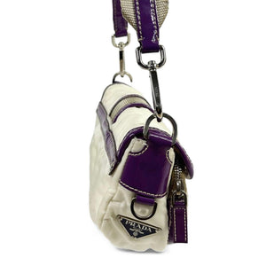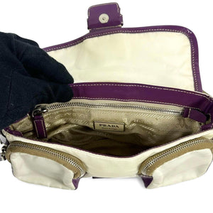 This Prada shoulder bag features a sleek cream body accented with purple trim and silver hardware. It includes a wide adjustable strap with metal clasps and a secure flap closure with decorative eyelets.