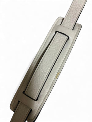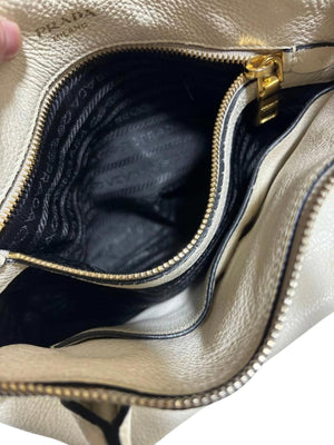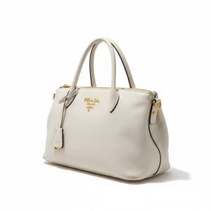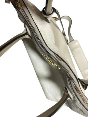 This Prada satchel bag is crafted from high-quality white leather with a textured finish. It features dual handles for easy carrying and gold-tone hardware including the iconic Prada logo on the front. The interior is lined with branded fabric and includes a zippered pocket for secure storage.