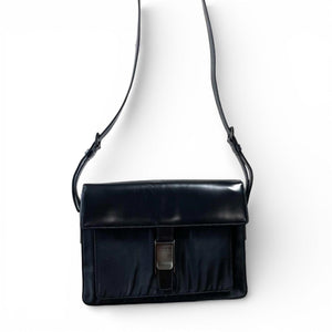 This Prada Women's shoulder bag features a sleek black leather design with a flap closure secured by a metal clasp. The adjustable shoulder strap allows for comfortable wear. The bag includes a front pocket and a spacious interior for essentials.
