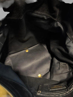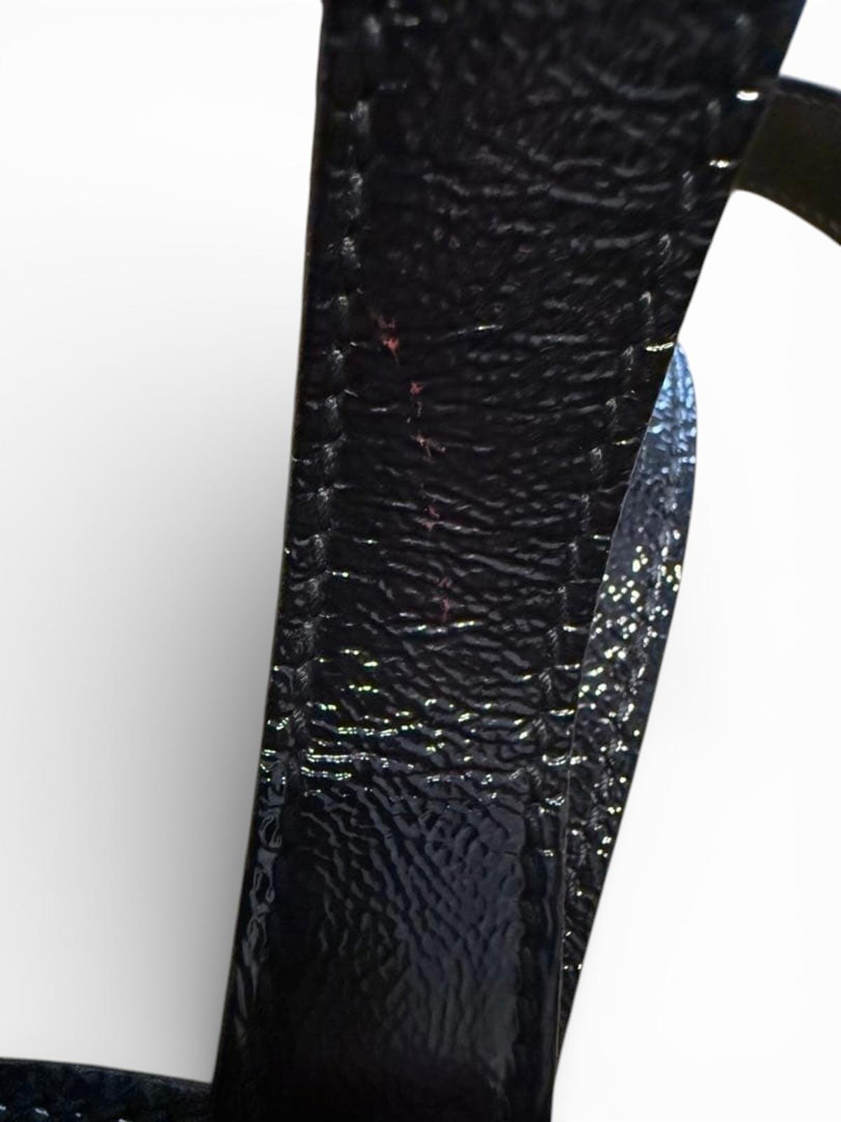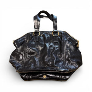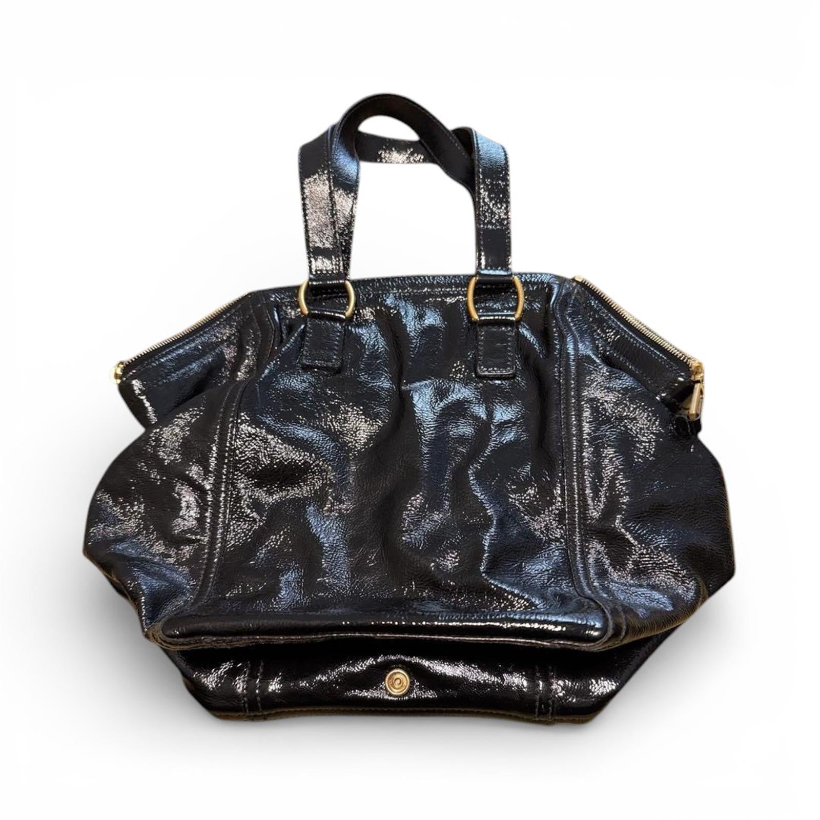 This Saint Laurent handbag features a sleek black patent leather exterior accented with gold-tone hardware. It includes dual top handles for easy carrying and a front zippered pocket with decorative studs. The bag offers both style and functionality with a spacious interior and secure snap closures.