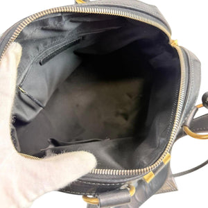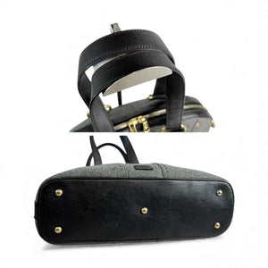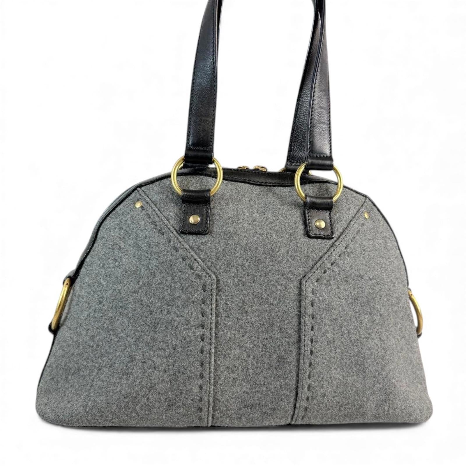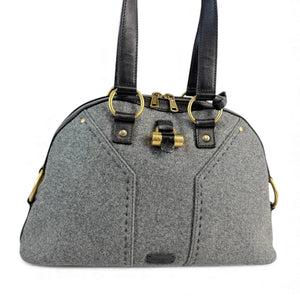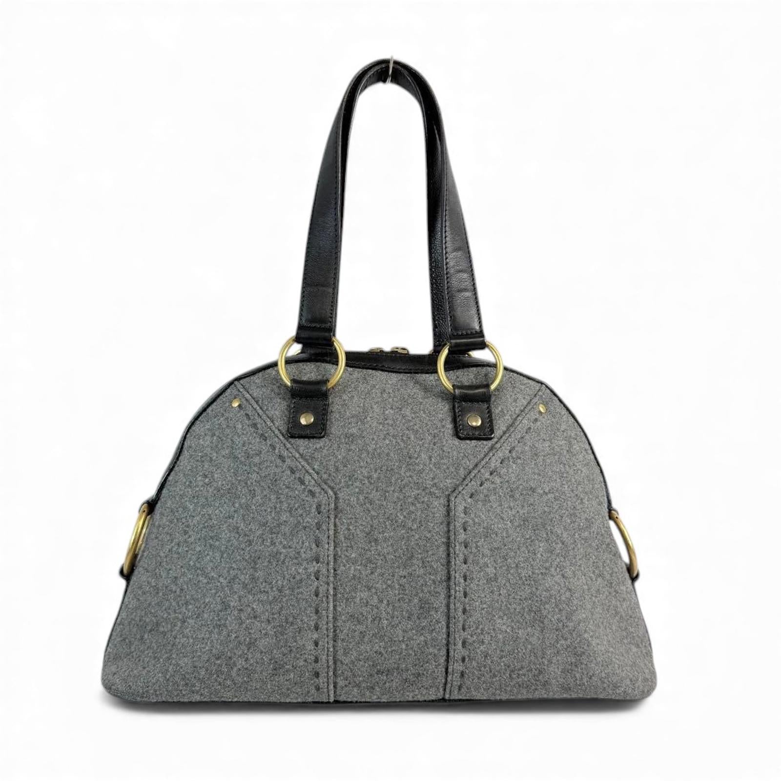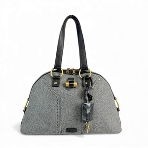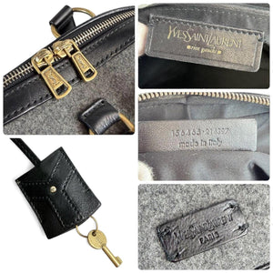 This Saint Laurent handbag features a sophisticated combination of grey wool fabric and black leather accents. It has sturdy double handles, gold-tone hardware, and a secure zip closure. The design includes a decorative lock and a leather key holder for added style.