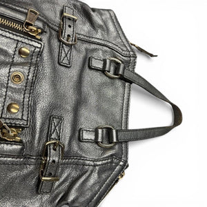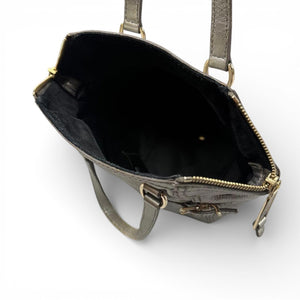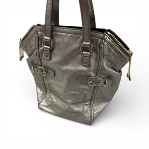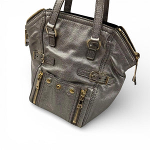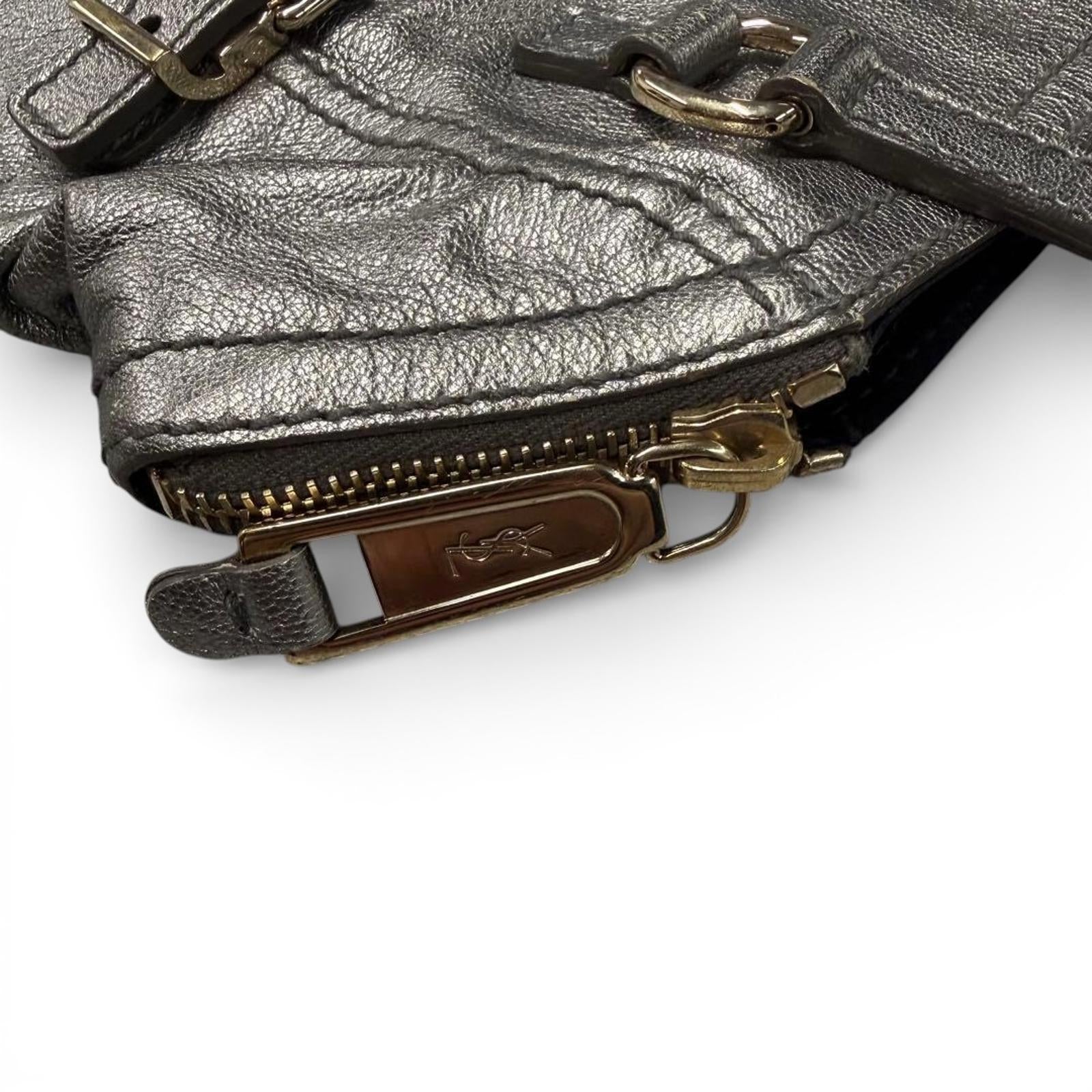 This Yves Saint Laurent handbag features a metallic leather exterior with gold-tone hardware, including zippers and buckle details. It has double handles for easy carrying and multiple compartments for practical use.