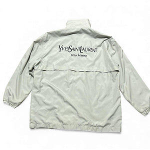 This Yves Saint Laurent men's windbreaker jacket in light grey features a full zip front and elasticated cuffs for a secure fit. It displays the iconic YSL logo embroidered on the front and a large branded print on the back, marked "pour homme".