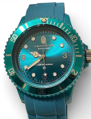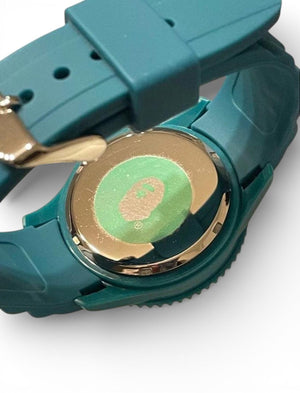 This A Bathing Ape watch features a vibrant teal silicone strap and a matching rotating bezel. The dial is a shimmering teal with luminous markers and hands for easy reading. It is designed for durability and style, suitable for everyday wear.