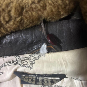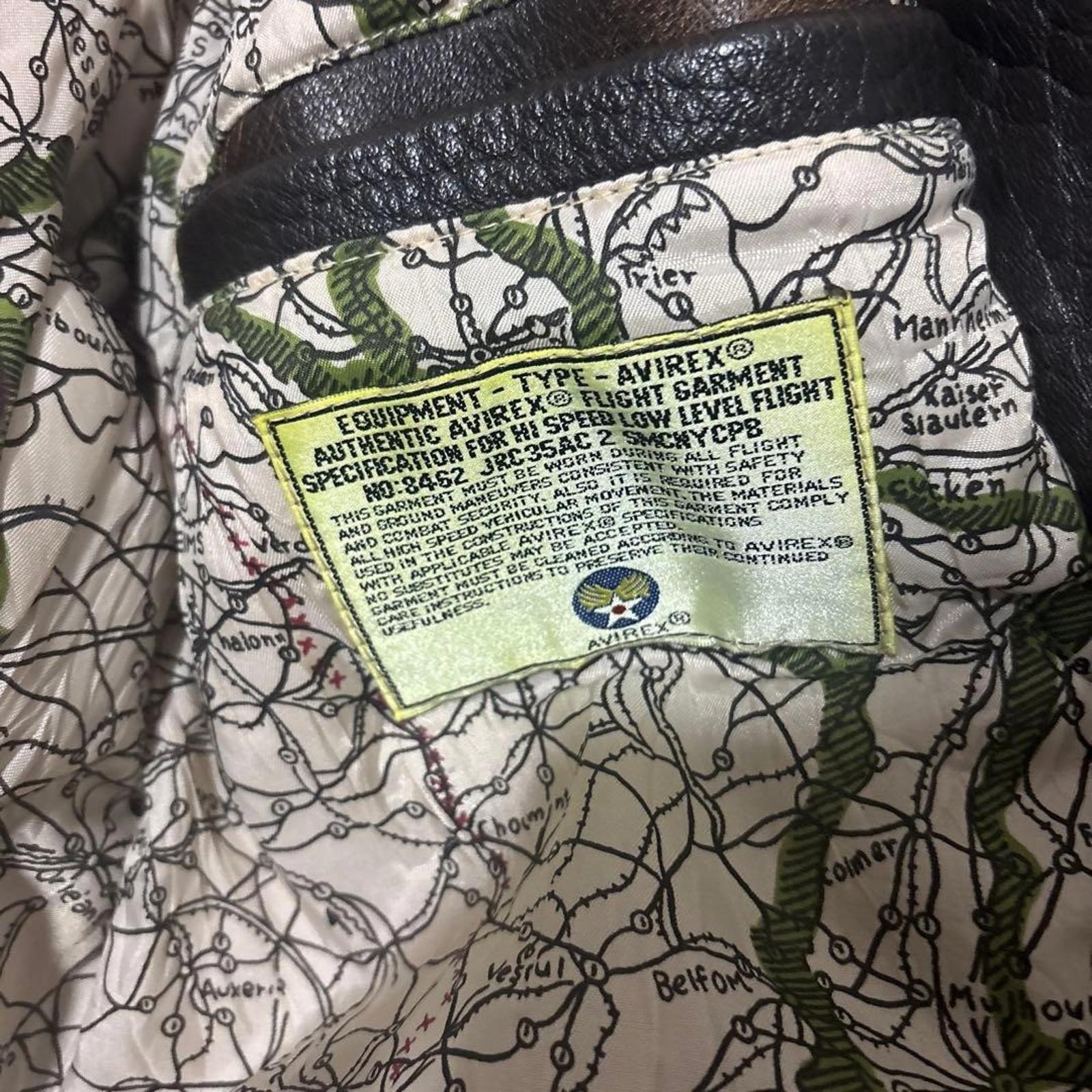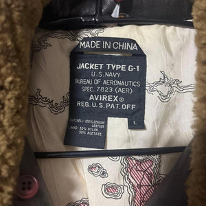This authentic Avirex U.S. Navy G-1 flight jacket features genuine leather construction with a warm fur collar. Decorated with multiple military patches, it reflects classic aviator style and heritage. The jacket is lined with nylon and acetate for comfort and durability.