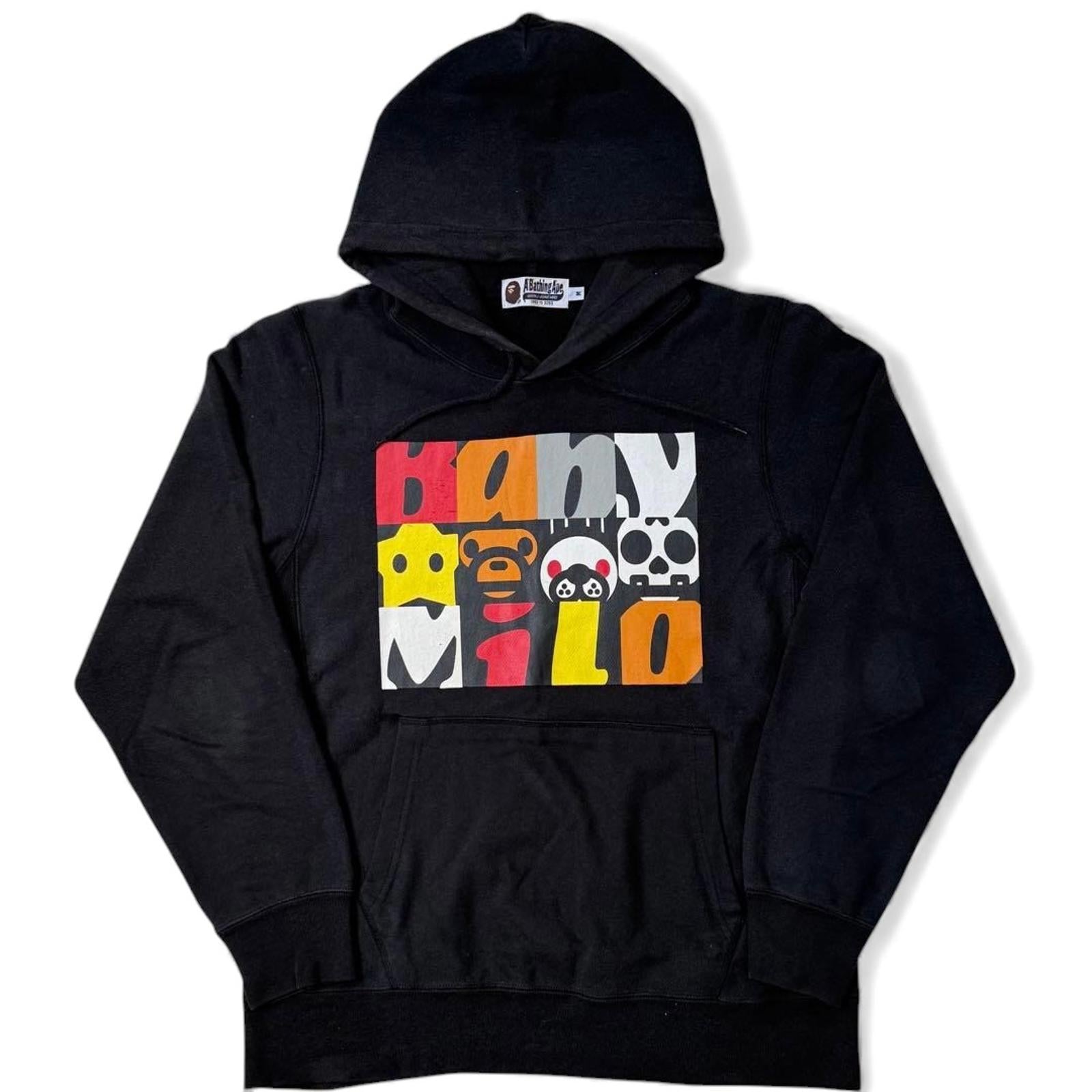 This black hoodie by Baby Milo features a vibrant, colourful graphic print on the front, showcasing the brand's iconic characters. Made from comfortable fabric, it includes a spacious front pocket and ribbed cuffs and hem for a snug fit.