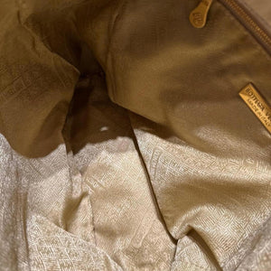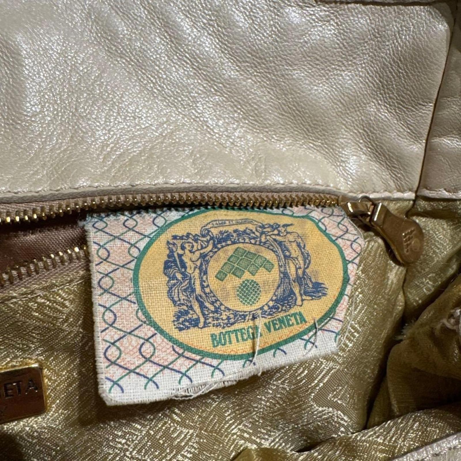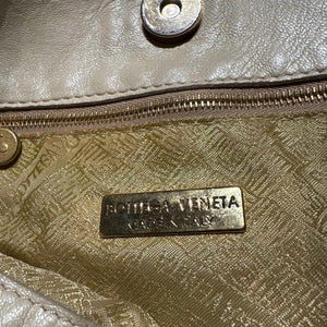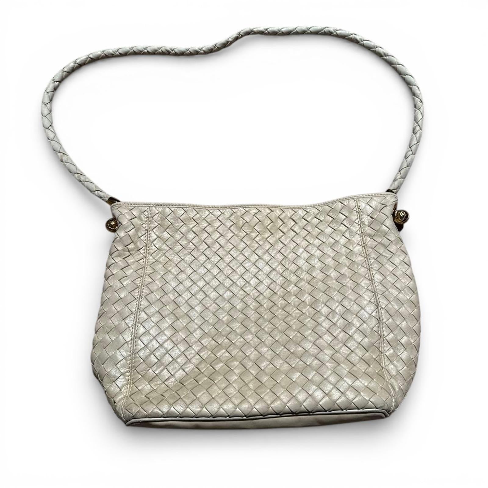 This Bottega Veneta shoulder bag features the brand’s signature intrecciato woven leather design in a subtle beige tone. It has a single shoulder strap and a smooth leather base, offering a refined and elegant look suitable for everyday use.
