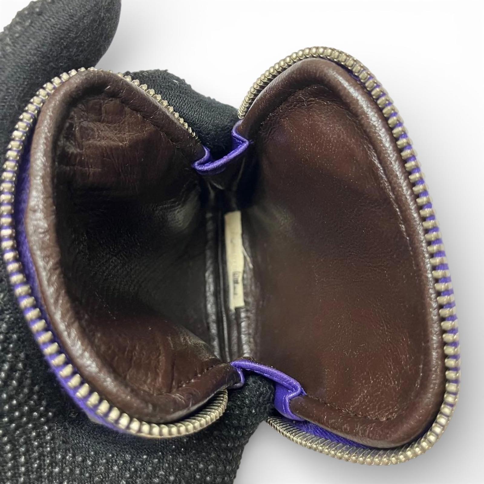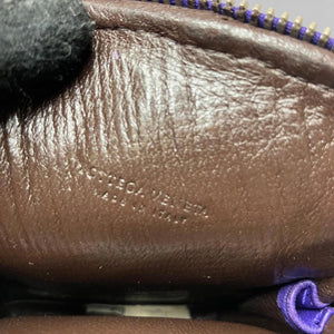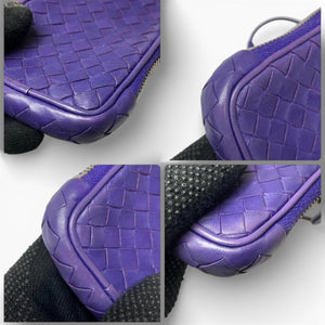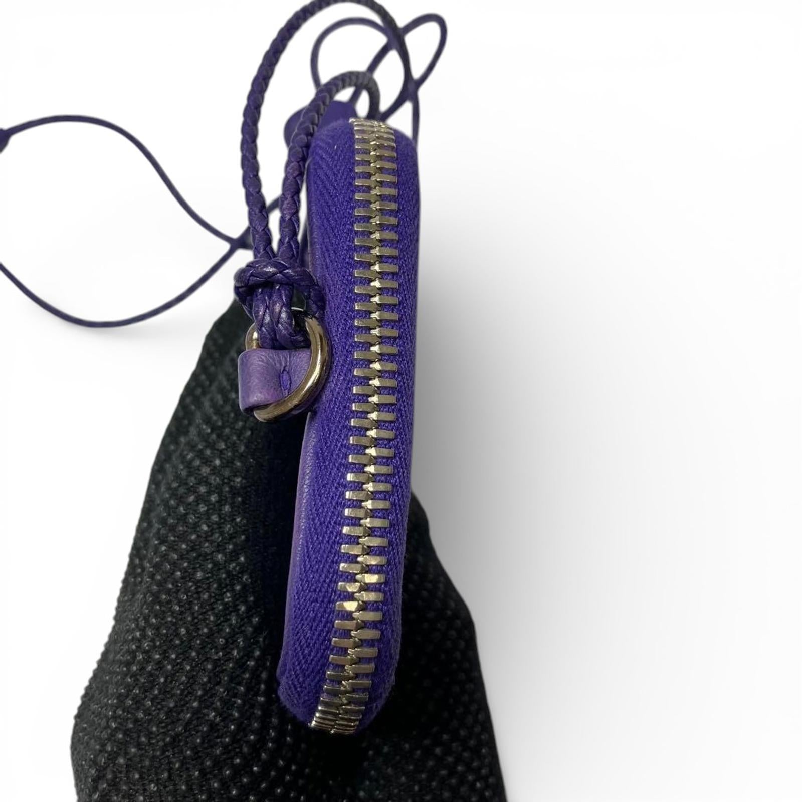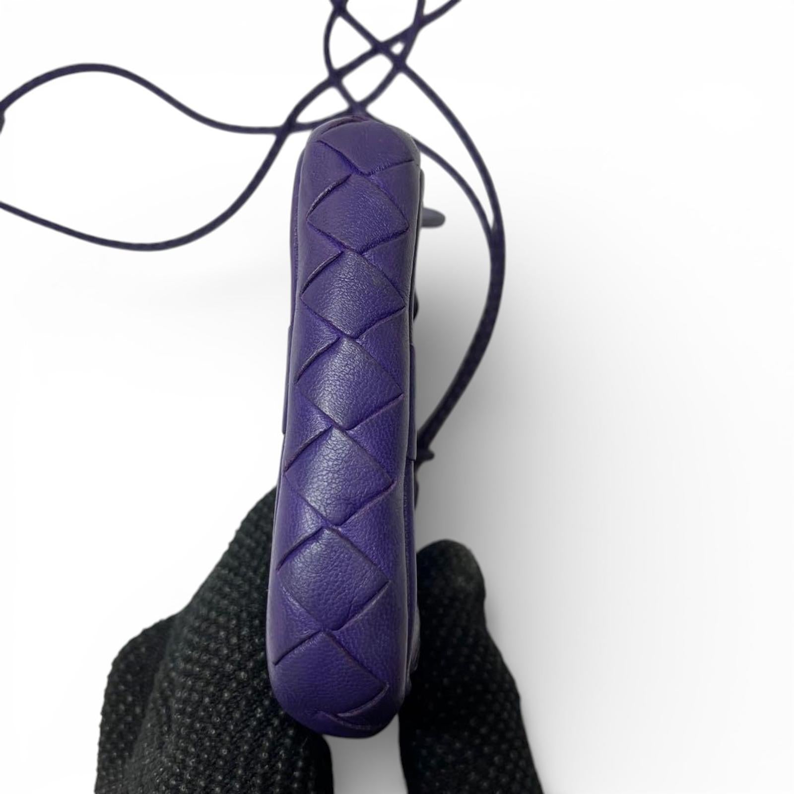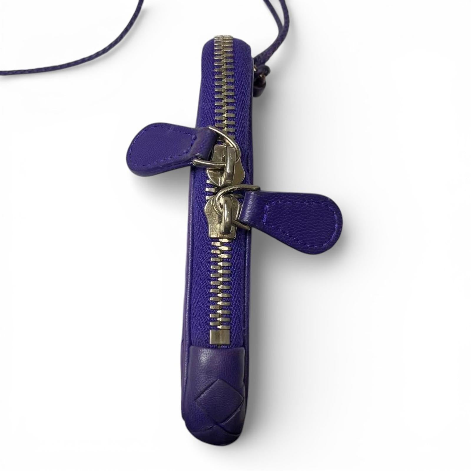 This elegant purple leather crossbody bag features a woven design characteristic of Bottega Veneta. It includes a zip closure with dual zipper pulls and a slim adjustable strap for comfortable wear. The compact size makes it perfect for carrying essentials hands-free.