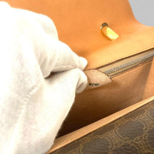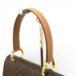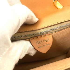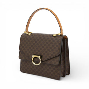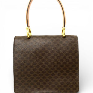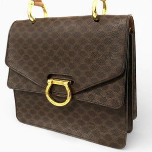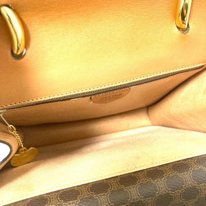 This vintage Celine handbag features a classic brown monogram leather exterior with a structured silhouette. It has a top handle in tan leather, gold-tone hardware including a distinctive clasp, and multiple compartments inside for organization.