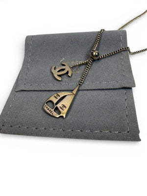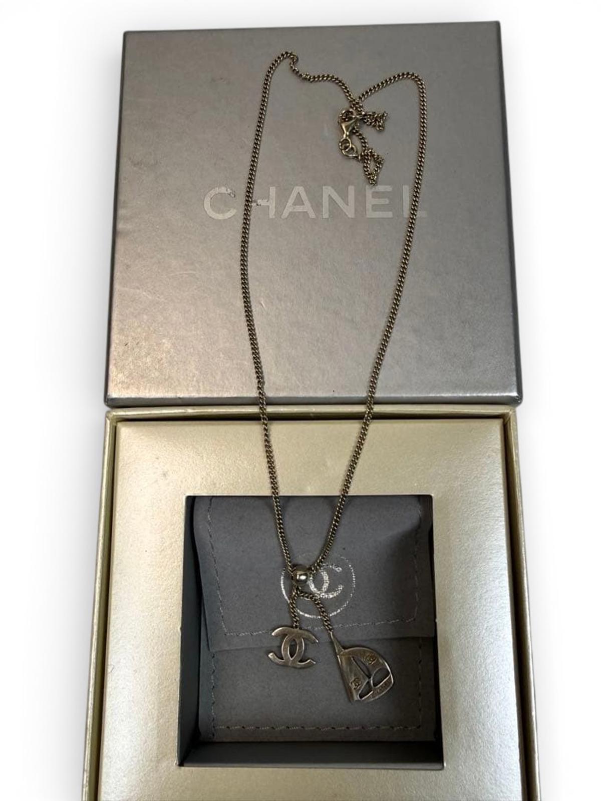 This Chanel necklace features a silver-tone chain with dual pendants: the iconic interlocking CC logo and a sailboat charm engraved with the Chanel name. It comes with its original branded packaging, including a box and a soft pouch for protection and storage.