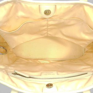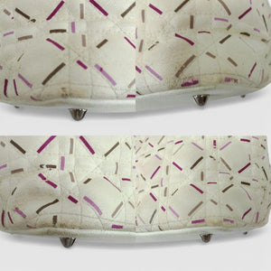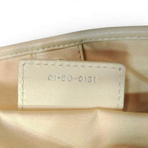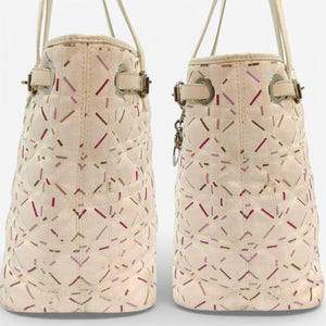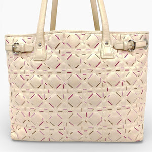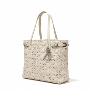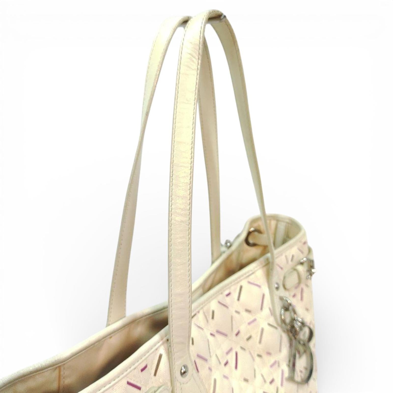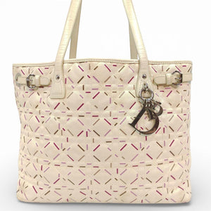 This elegant Christian Dior tote bag features a quilted leather exterior with a distinctive stitched pattern in soft cream tones accented by subtle pink and brown details. It includes two sturdy shoulder straps and a signature Dior charm hanging from one handle.