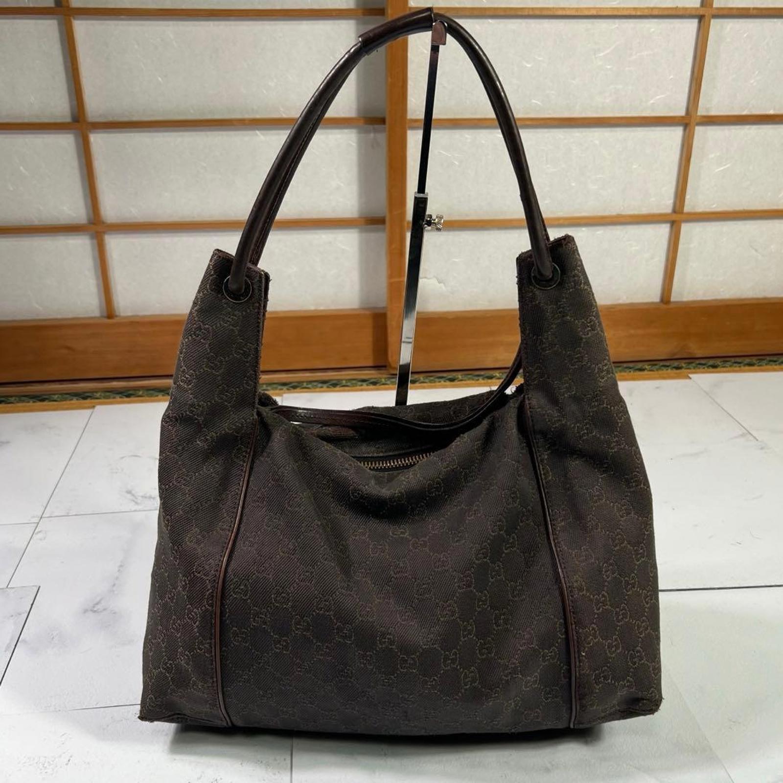 This Gucci shoulder bag features the iconic brown monogram canvas with a structured yet spacious design. It has sturdy leather handles for comfortable carrying and a zippered closure to keep your belongings secure. The bag is versatile for everyday use or special occasions.