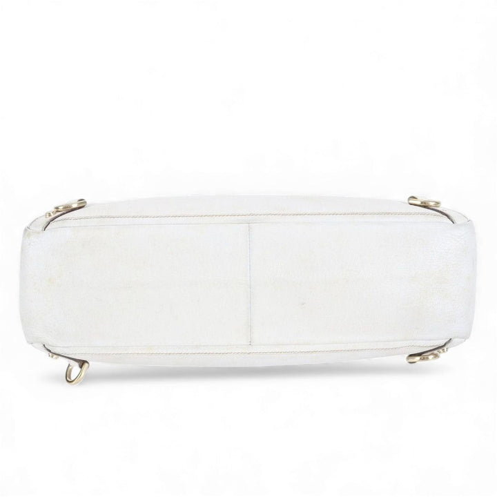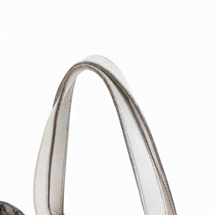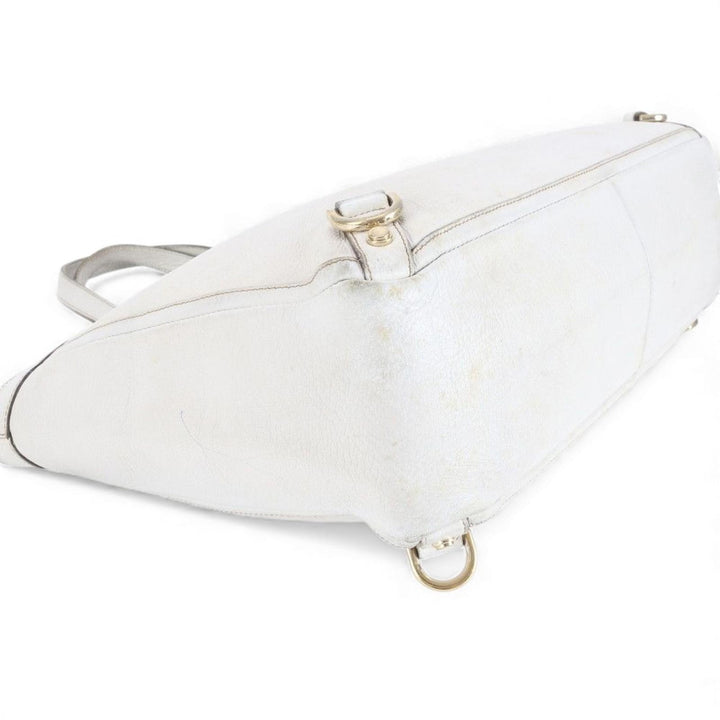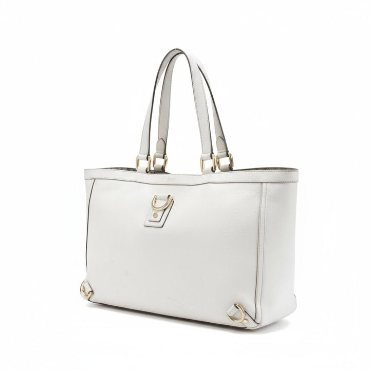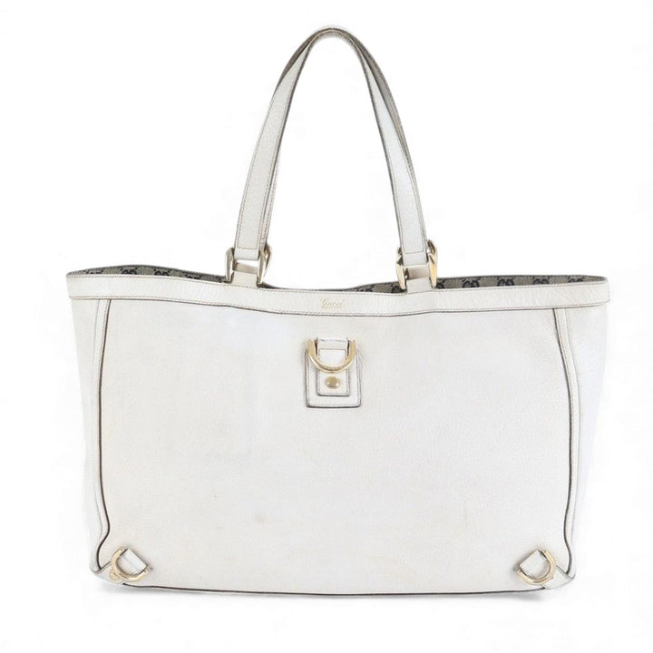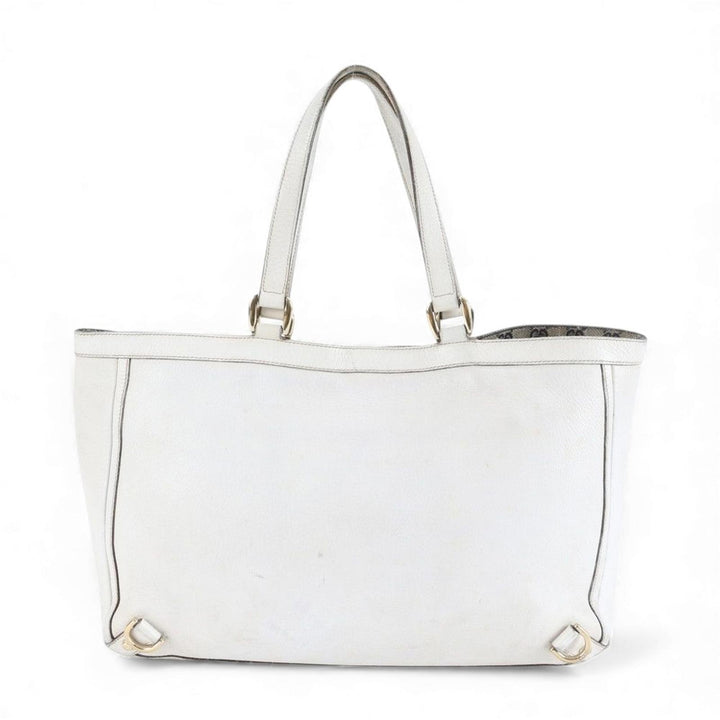 This white leather tote bag from Gucci offers a spacious and stylish option for everyday use. Crafted from quality leather, it features double handles and subtle gold-tone hardware for a classic look. The interior is lined with a signature pattern, providing both elegance and functionality.