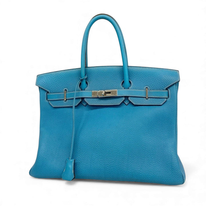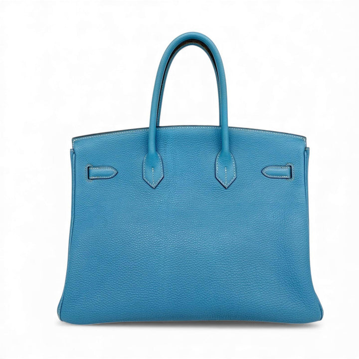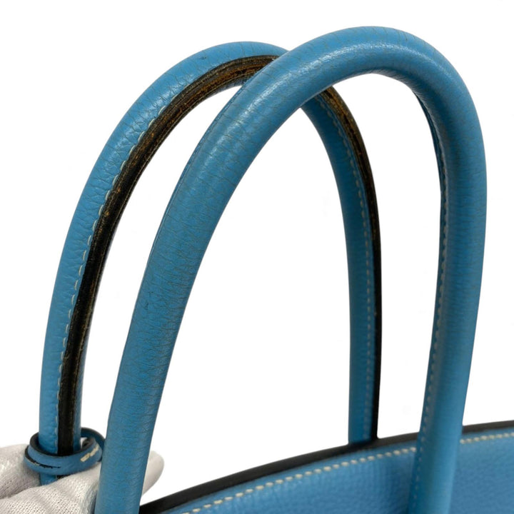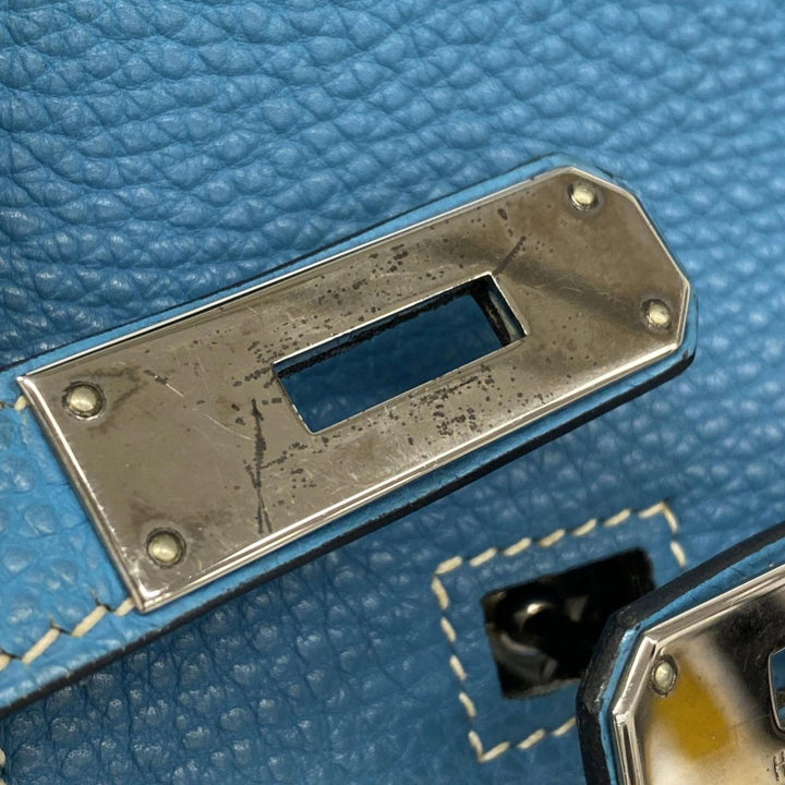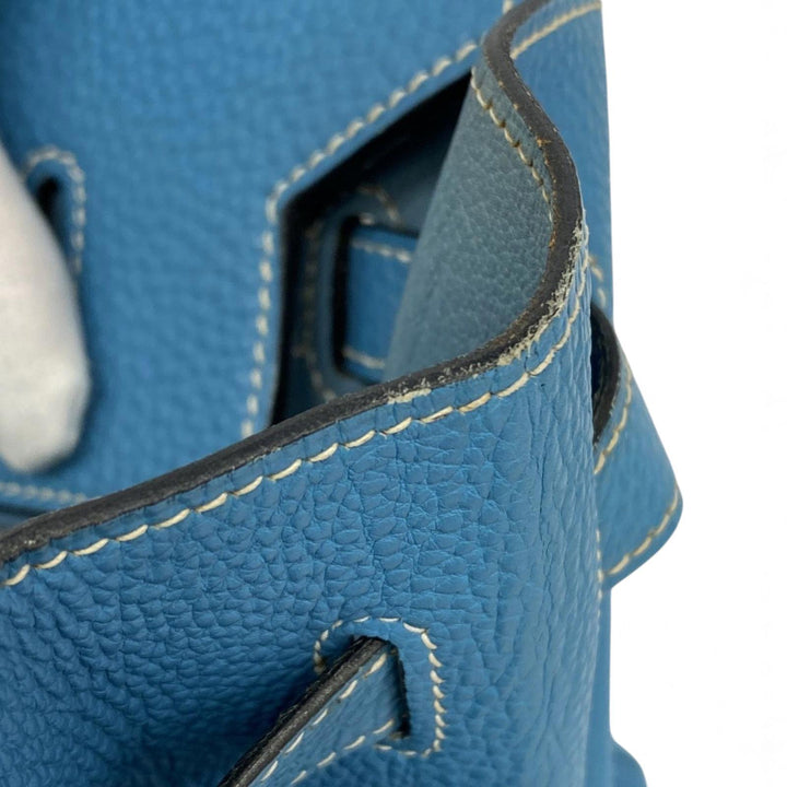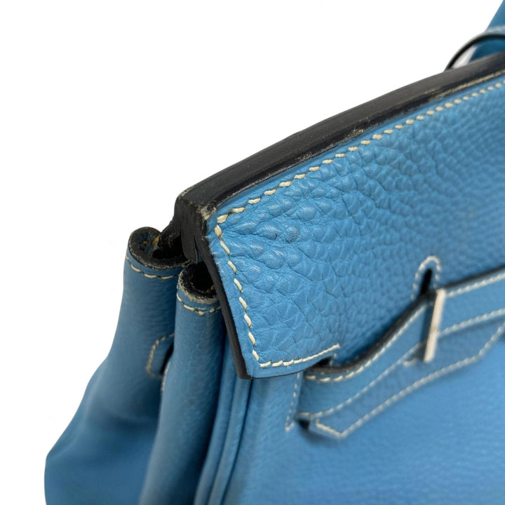 This Hermès Birkin bag in blue leather is a classic and elegant handbag featuring sturdy double handles, silver-tone hardware, and a structured silhouette. The bag offers a spacious interior suitable for daily essentials and formal occasions.