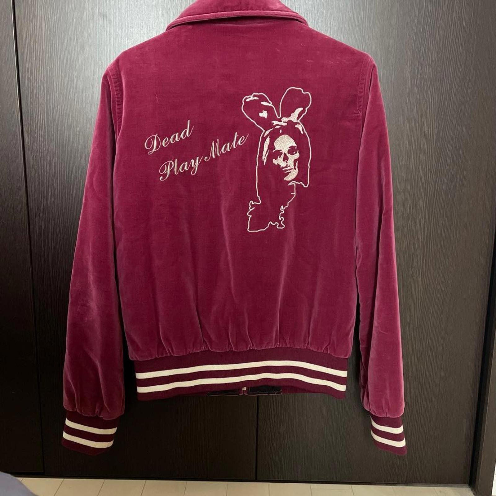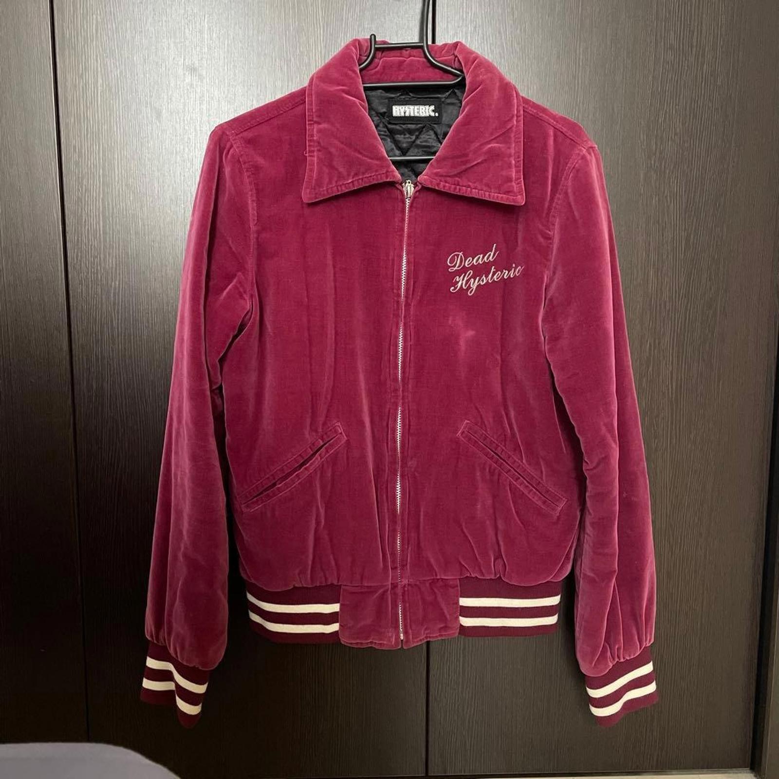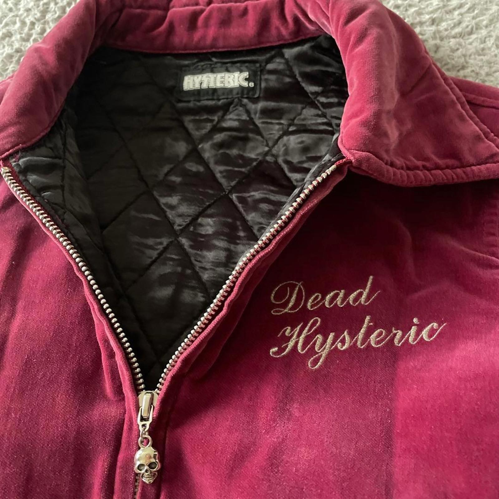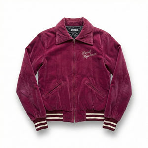 This burgundy velvet bomber jacket by Hysteric features a front zip closure, ribbed cuffs and waistband with white stripe detailing, and front pockets. The jacket is embroidered with the phrases 'Dead Hysteric' on the front chest and 'Dead Play Mate' alongside a unique face design on the back, adding a distinctive touch.