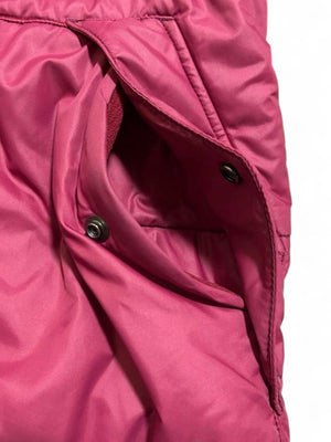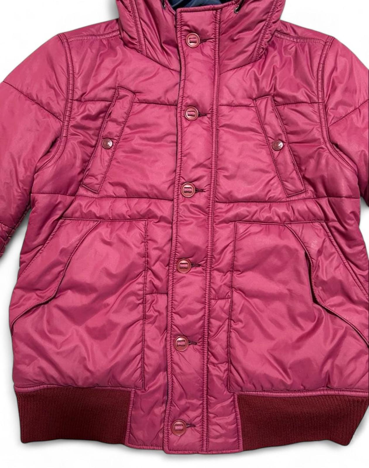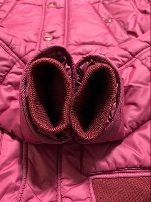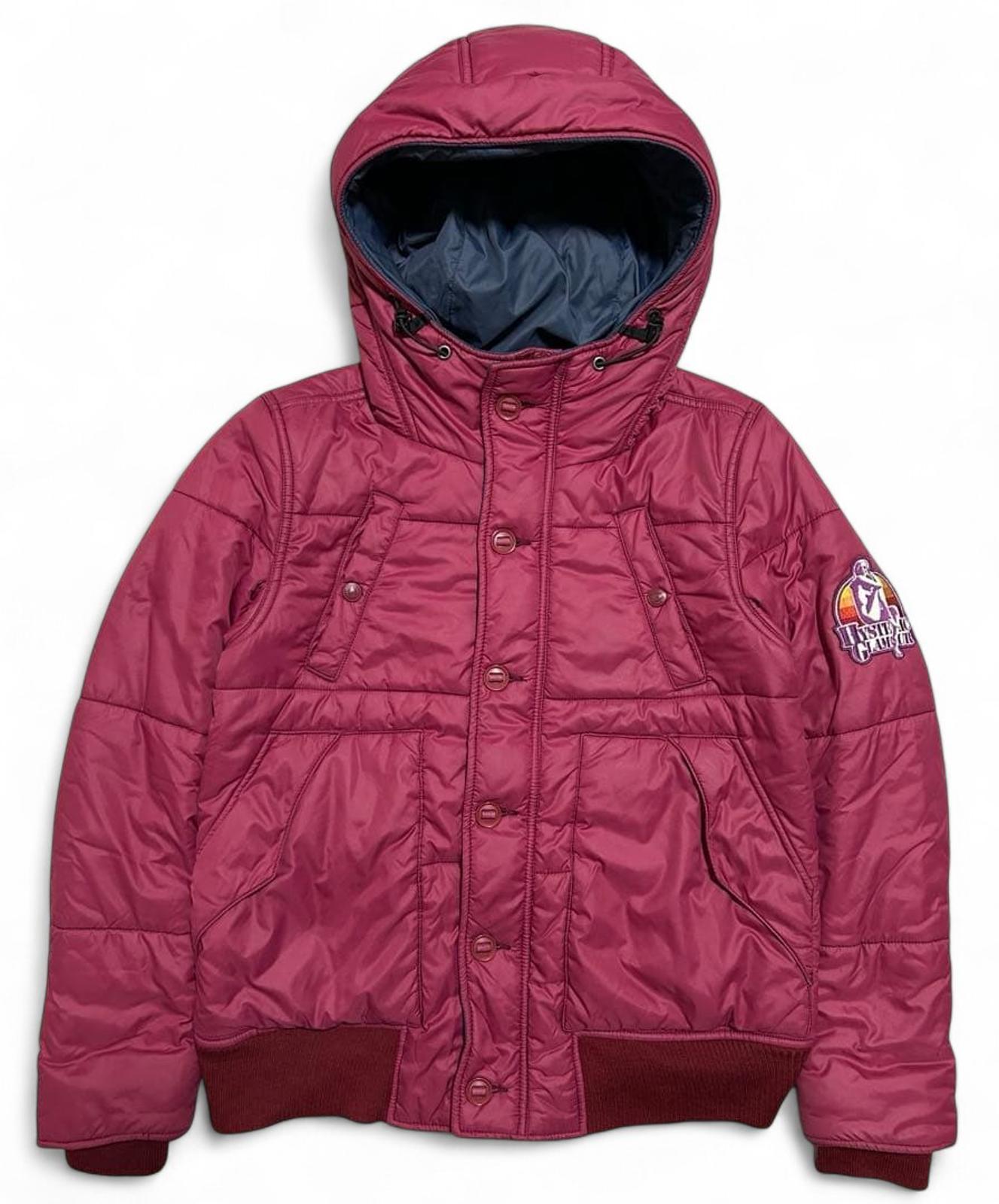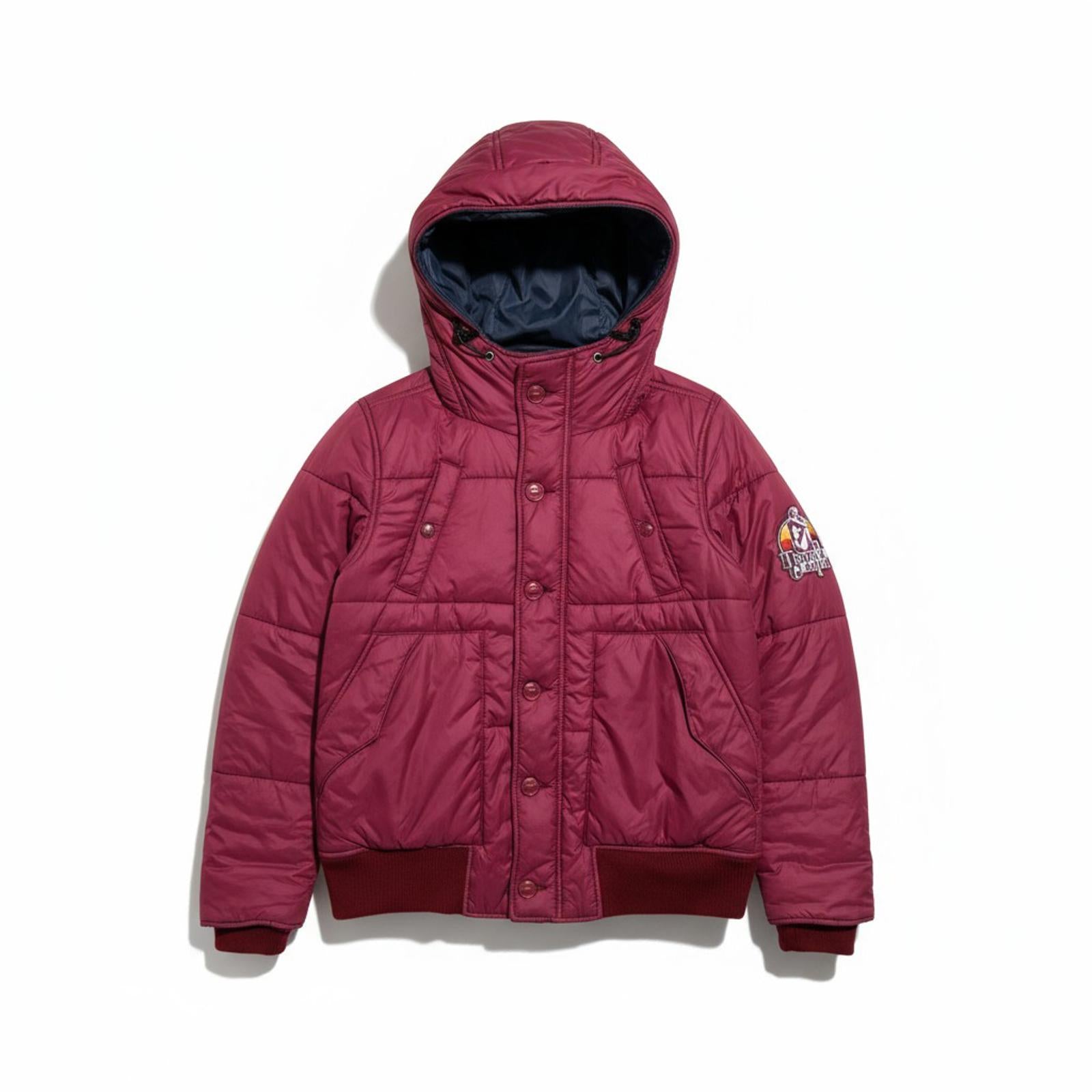This men's quilted jacket from Hysteric Glamour features a rich burgundy colour with a padded design for warmth and comfort. It includes a hood with adjustable drawstrings, a front snap-button closure, and ribbed cuffs and hem for a snug fit. The jacket also has side pockets and a distinctive Prada logo patch on the sleeve.