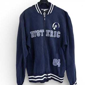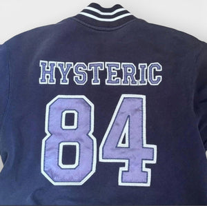 This Hysteric men's varsity jacket features a classic navy blue colour with white striped ribbed cuffs, collar, and hem. The front displays "HYSTERIC" lettering with a small logo patch on the chest and the number 84 on the front and back. It has a full zip closure and side pockets, perfect for casual wear and layering.