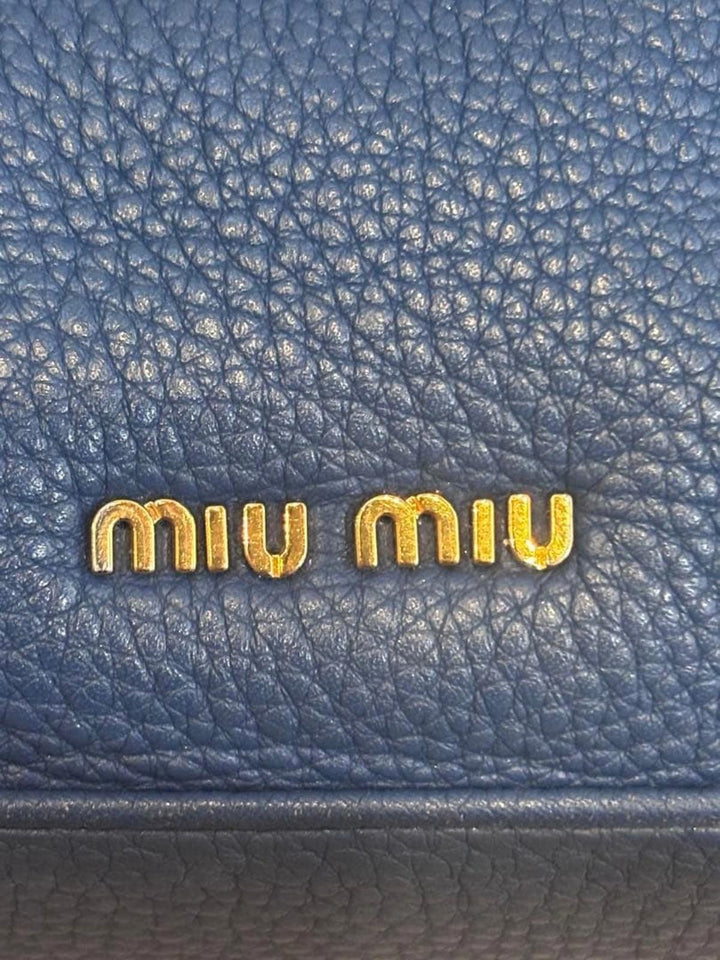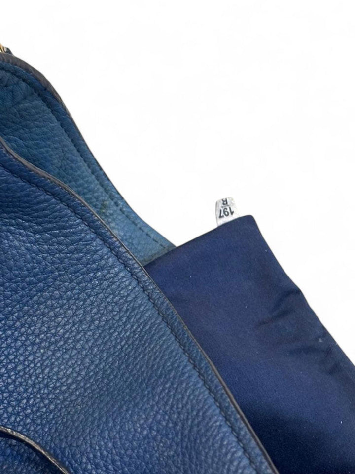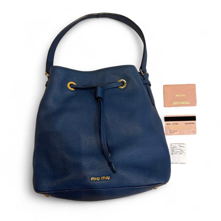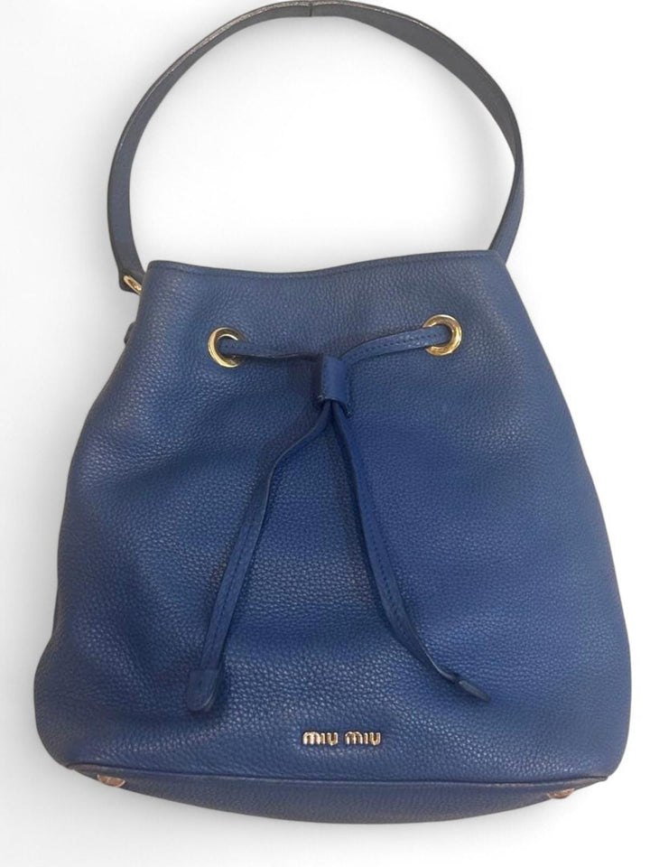 This Miu Miu bucket bag is crafted from pebbled blue leather, featuring gold-tone hardware and a drawstring closure for a secure yet stylish finish. The spacious interior makes it a practical choice for everyday use while maintaining a refined look.