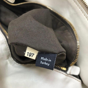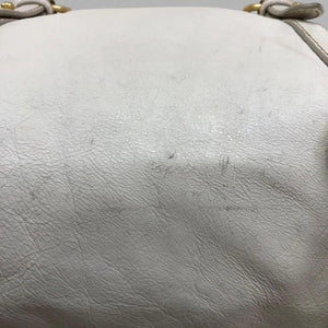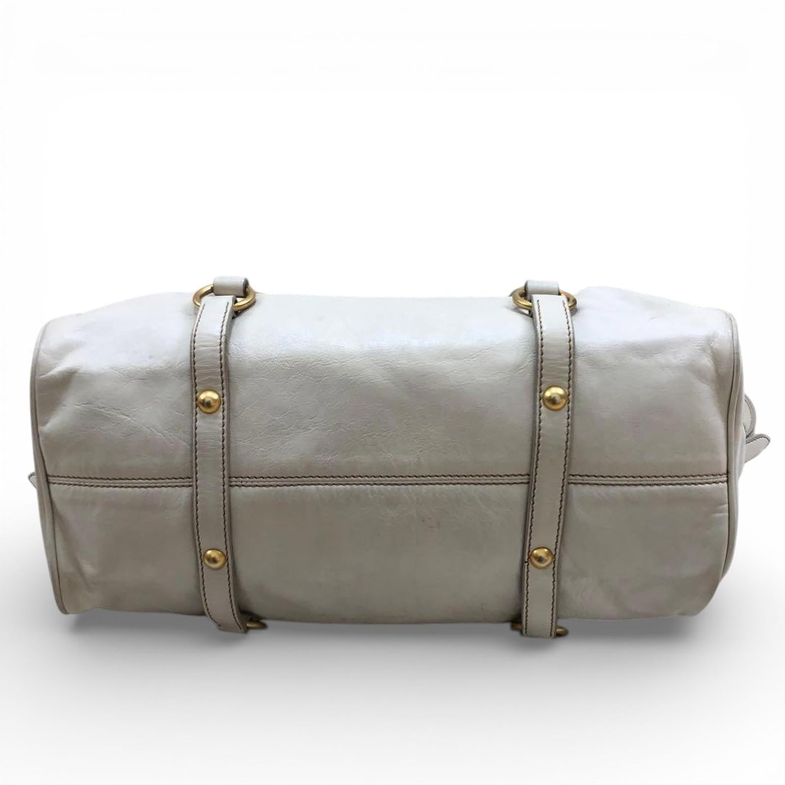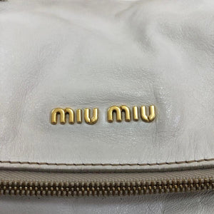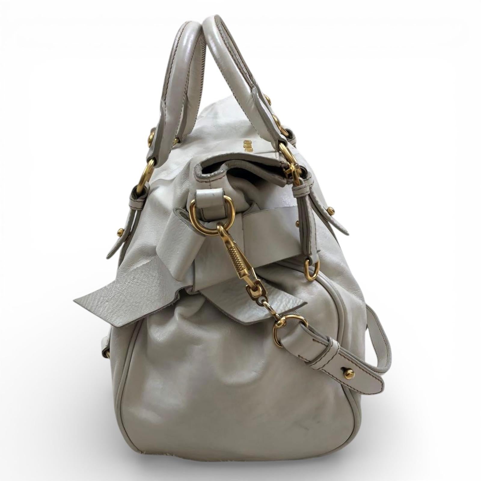 This Miu Miu satchel bag is crafted from soft gray leather, featuring a structured silhouette with dual top handles and a detachable shoulder strap for versatile wear. The bag is accented with gold-tone hardware and a distinctive leather bow detail on the side, adding a touch of elegance. It offers ample space and a secure zip closure to keep belongings safe.