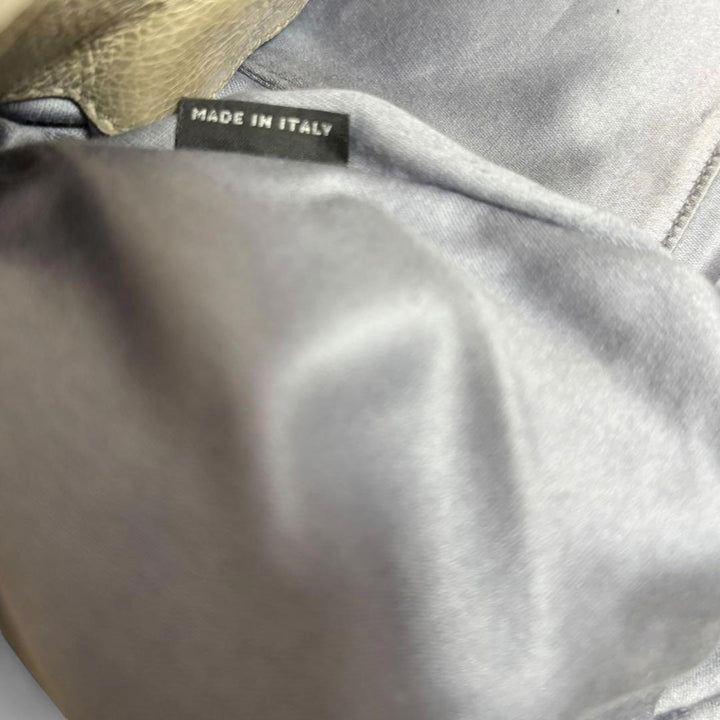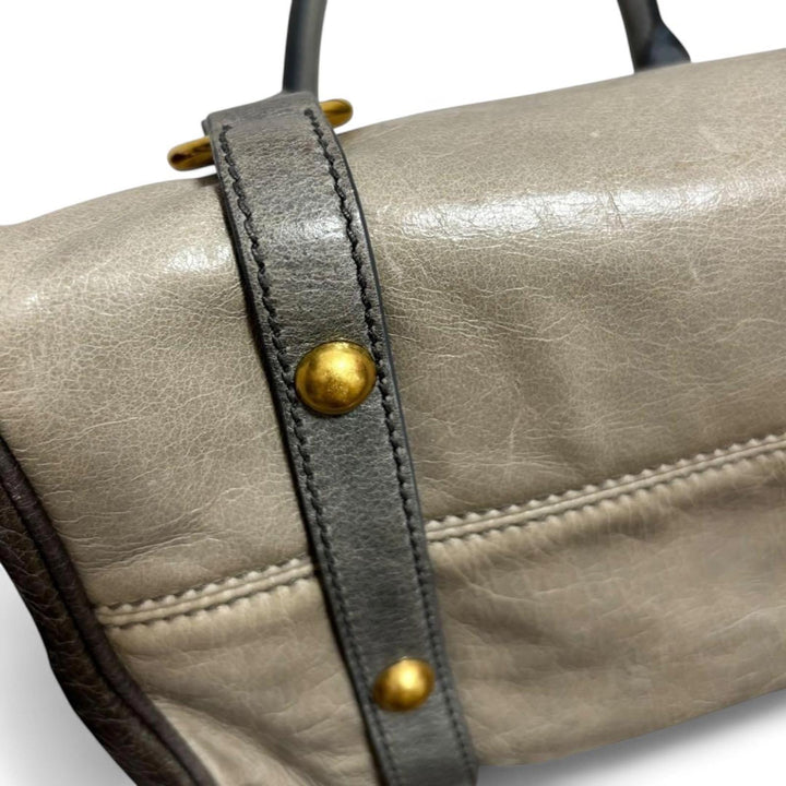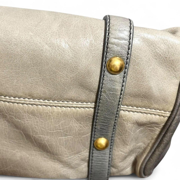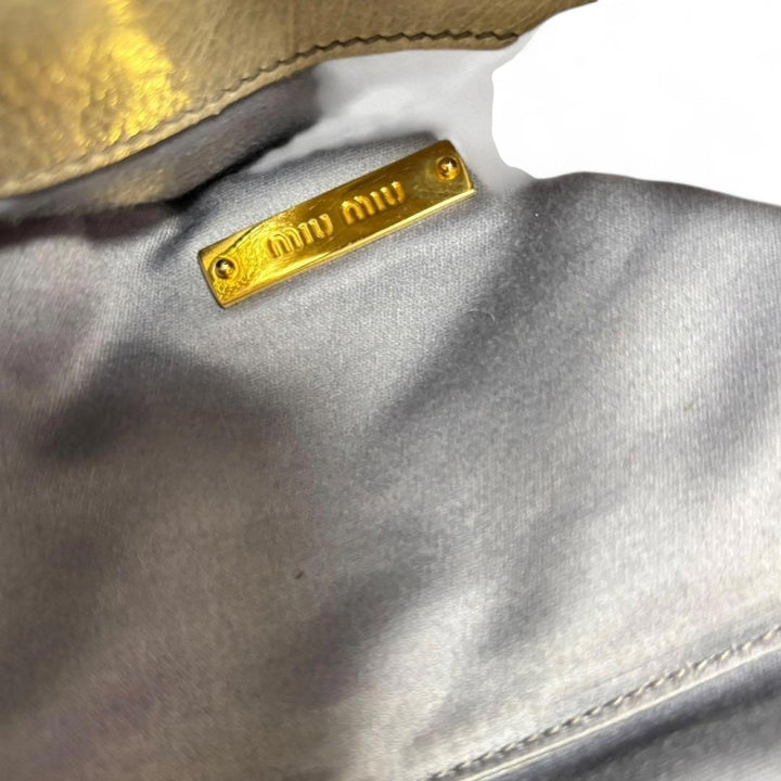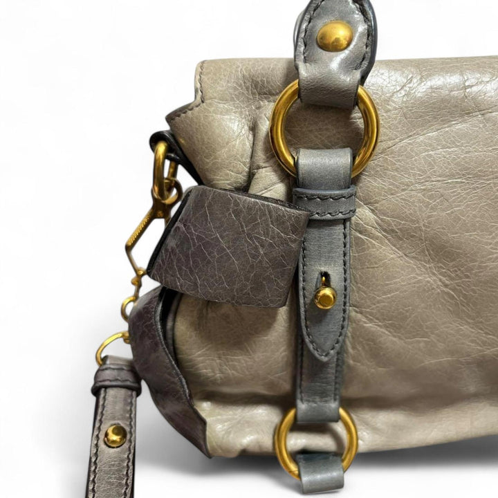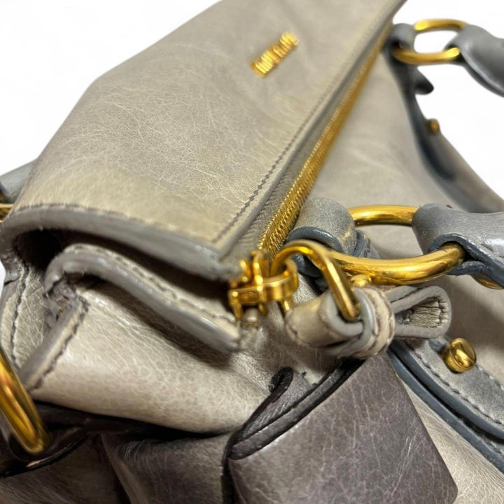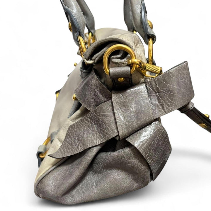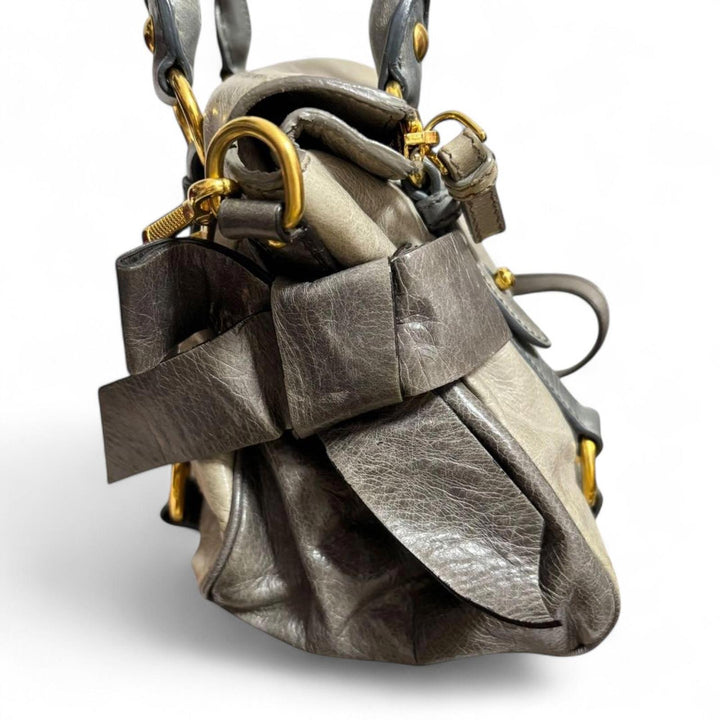 This elegant Miu Miu handbag features a sophisticated bow detail on the side, crafted from high-quality leather in shades of grey and cream. It includes dual handles and a detachable shoulder strap for versatile carrying options. The bag is adorned with gold-tone hardware, enhancing its luxurious appeal.