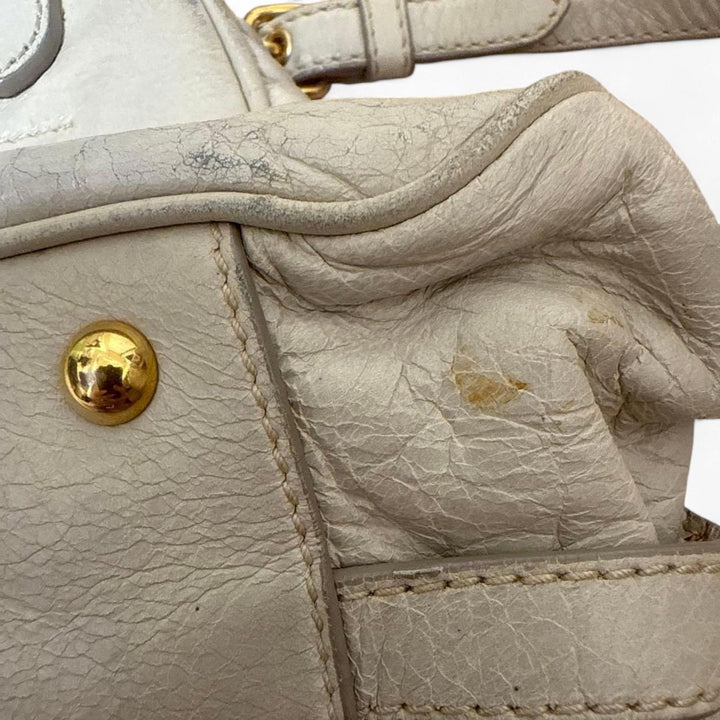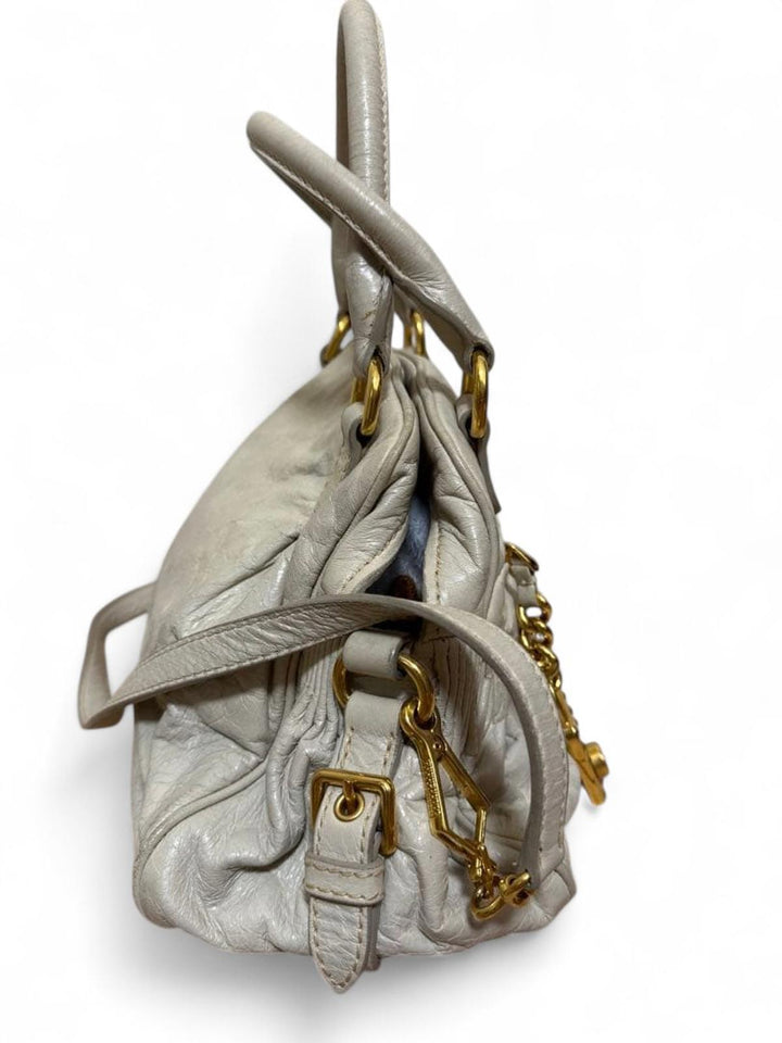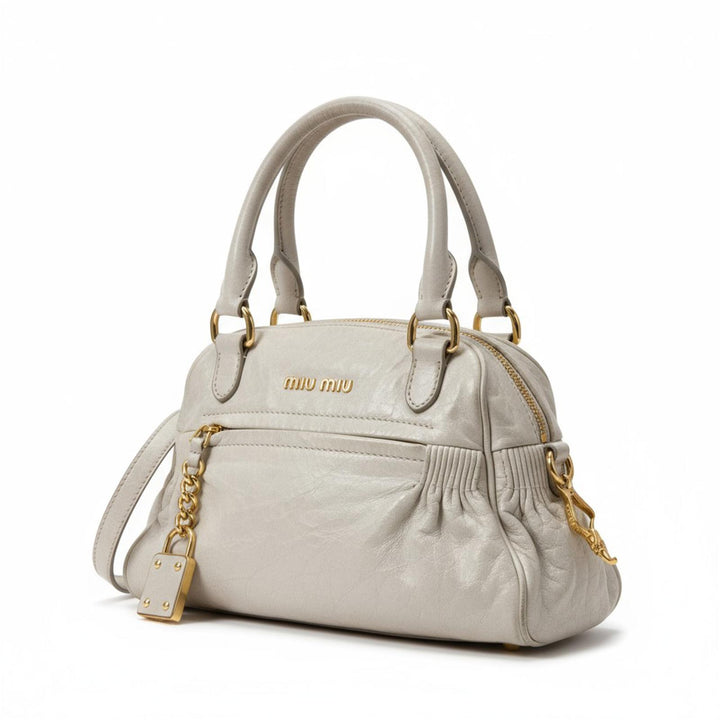 This Miu Miu handbag features a soft leather construction in a neutral tone, complemented by gold-tone hardware including a decorative chain and padlock detail. The bag has dual top handles and a detachable shoulder strap, offering versatile carrying options. It includes a zip closure and external pocket for added convenience.