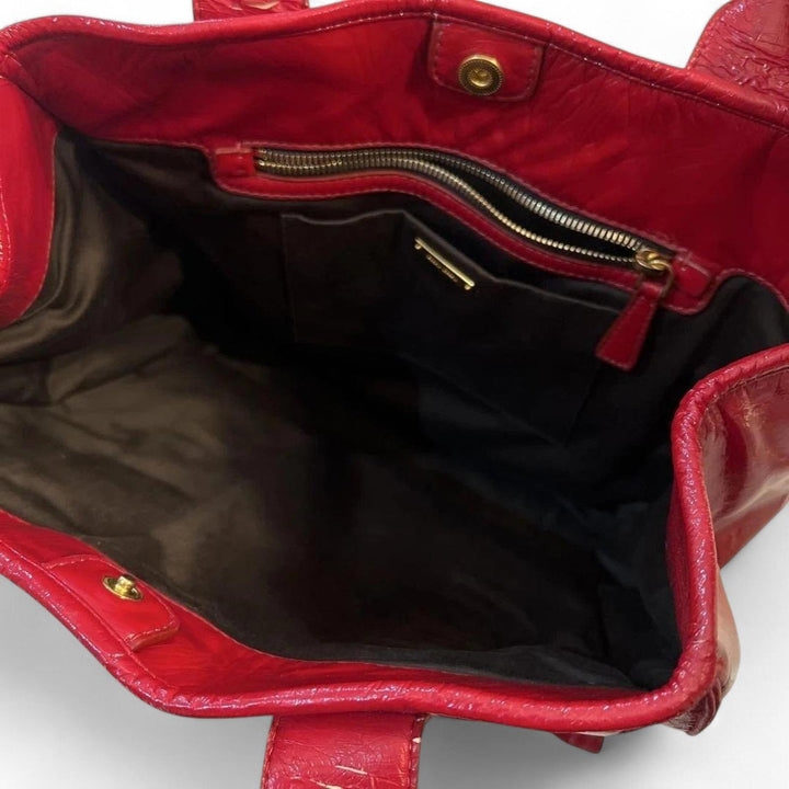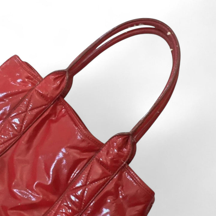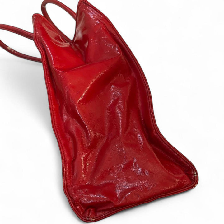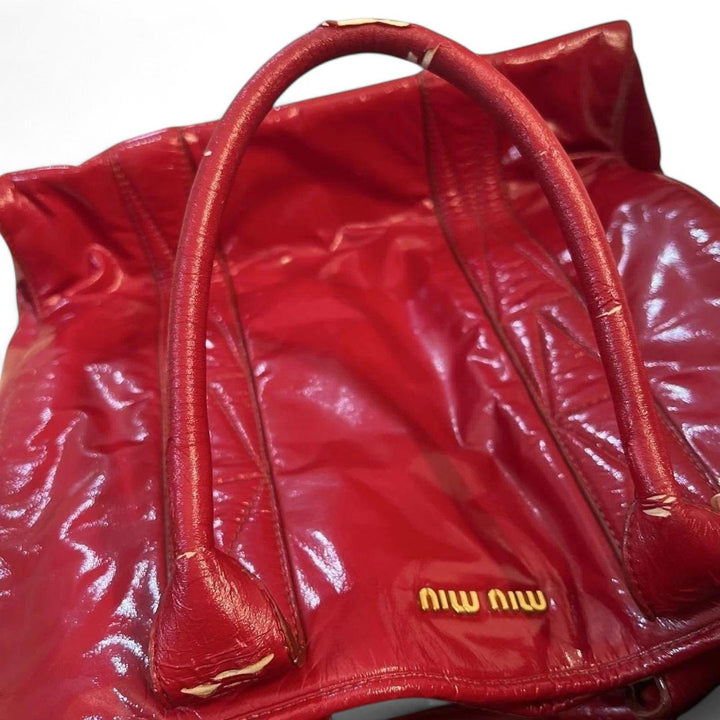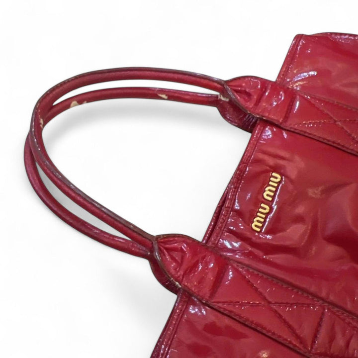This Miu Miu tote bag is crafted from glossy red patent leather, featuring dual top handles and gold-tone hardware. The interior is lined and includes a zippered pocket for secure storage. It closes with a snap button for easy access.