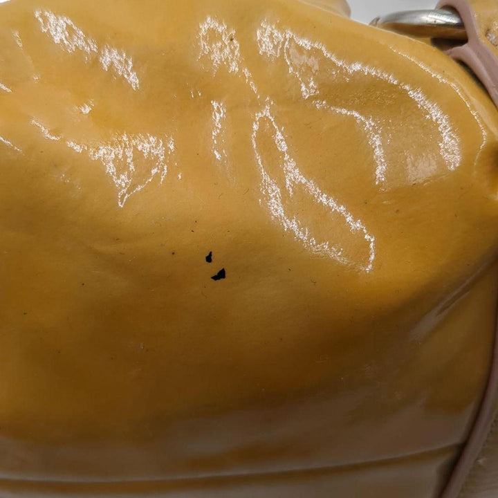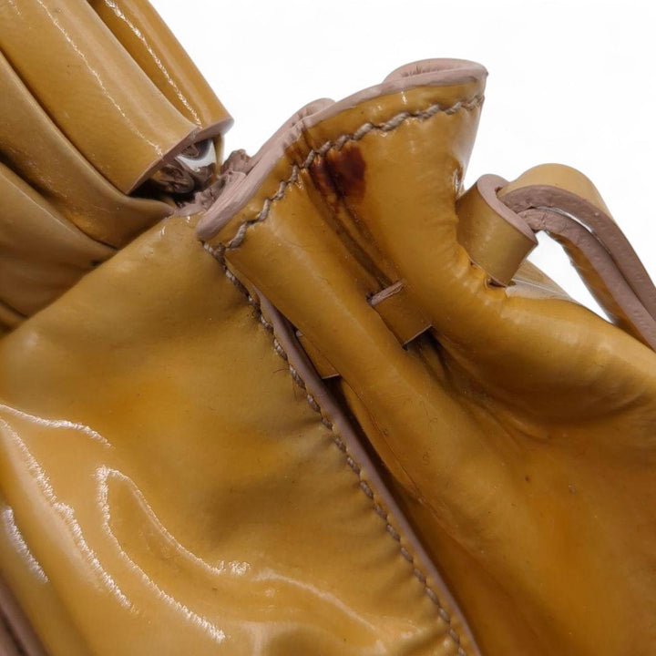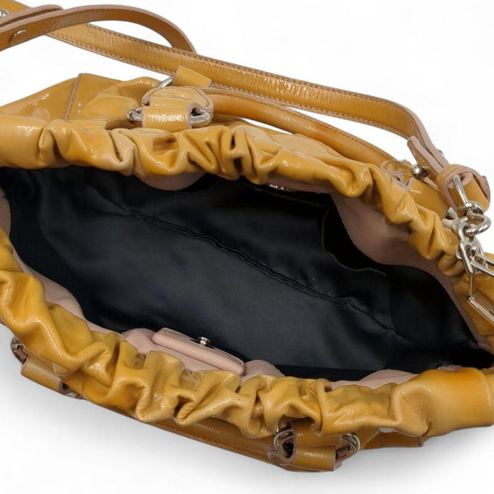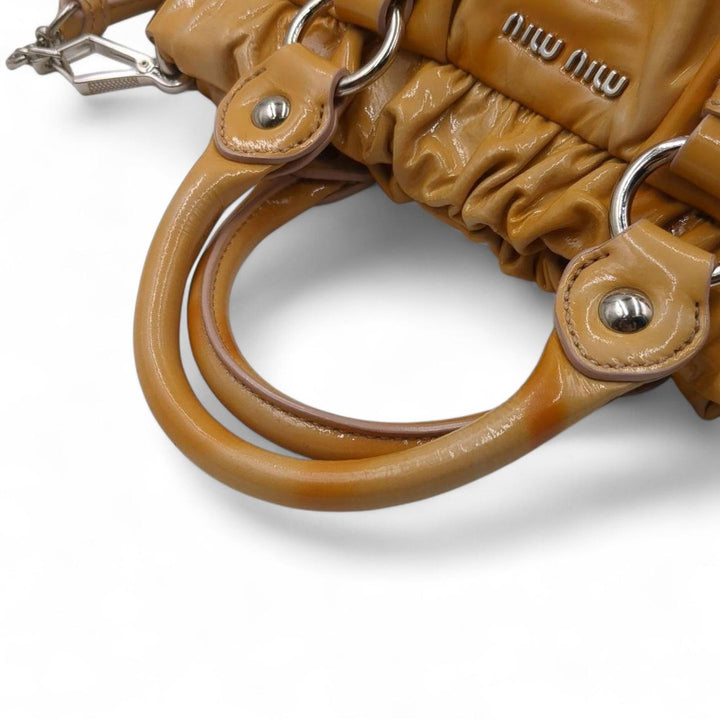 This Miu Miu handbag is crafted from tan patent leather with a glossy finish. It features dual top handles and a detachable shoulder strap for versatile carrying options. The bag has silver-tone hardware accents and a ruched design detail at the top.