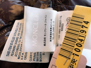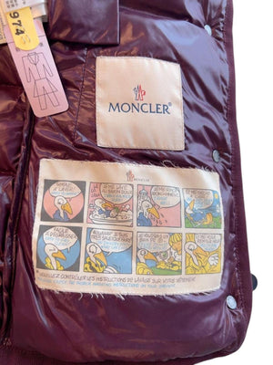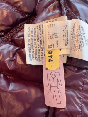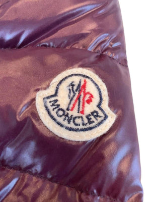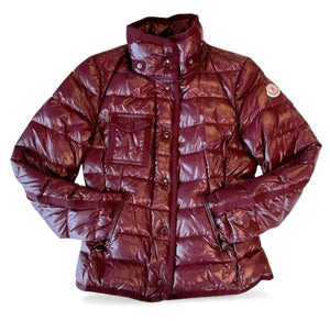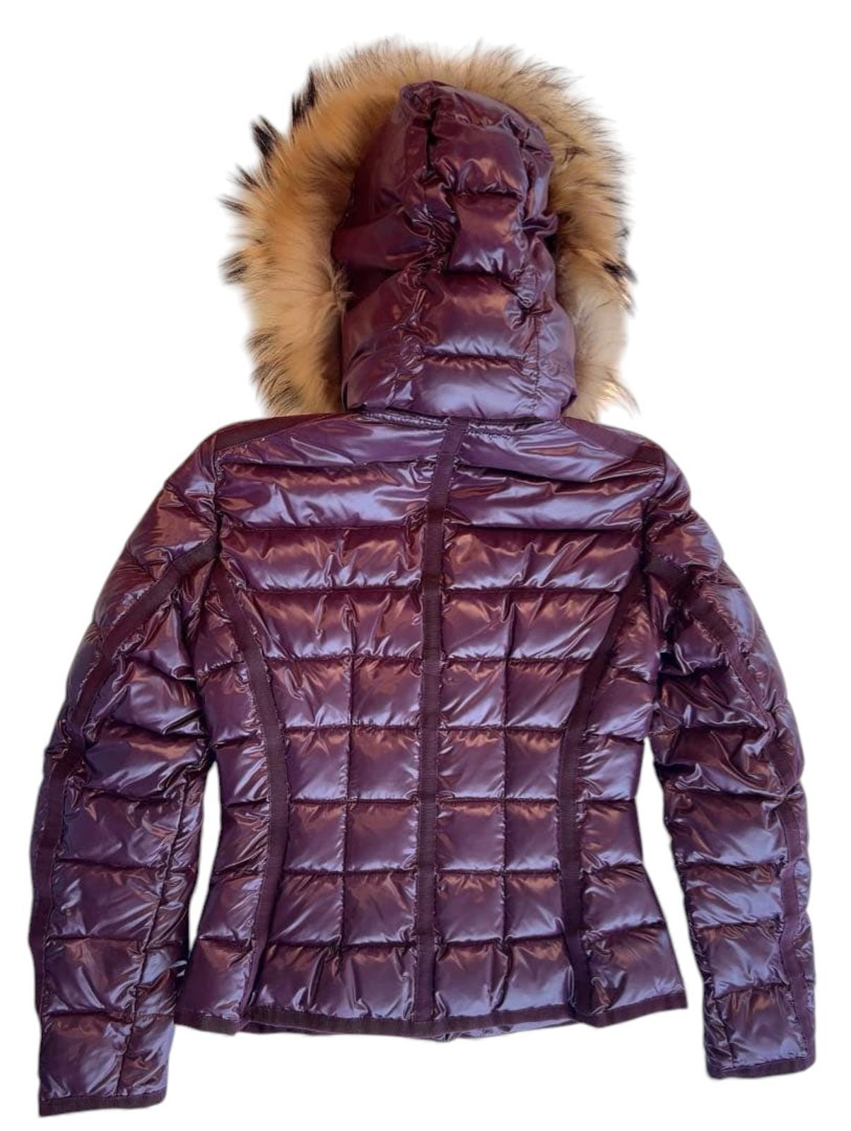 This Moncler women's puffer jacket in a rich burgundy colour features a glossy finish and a fur-trimmed hood for added warmth and style. It includes multiple pockets, zip and button closures, and a fitted silhouette for a flattering look.