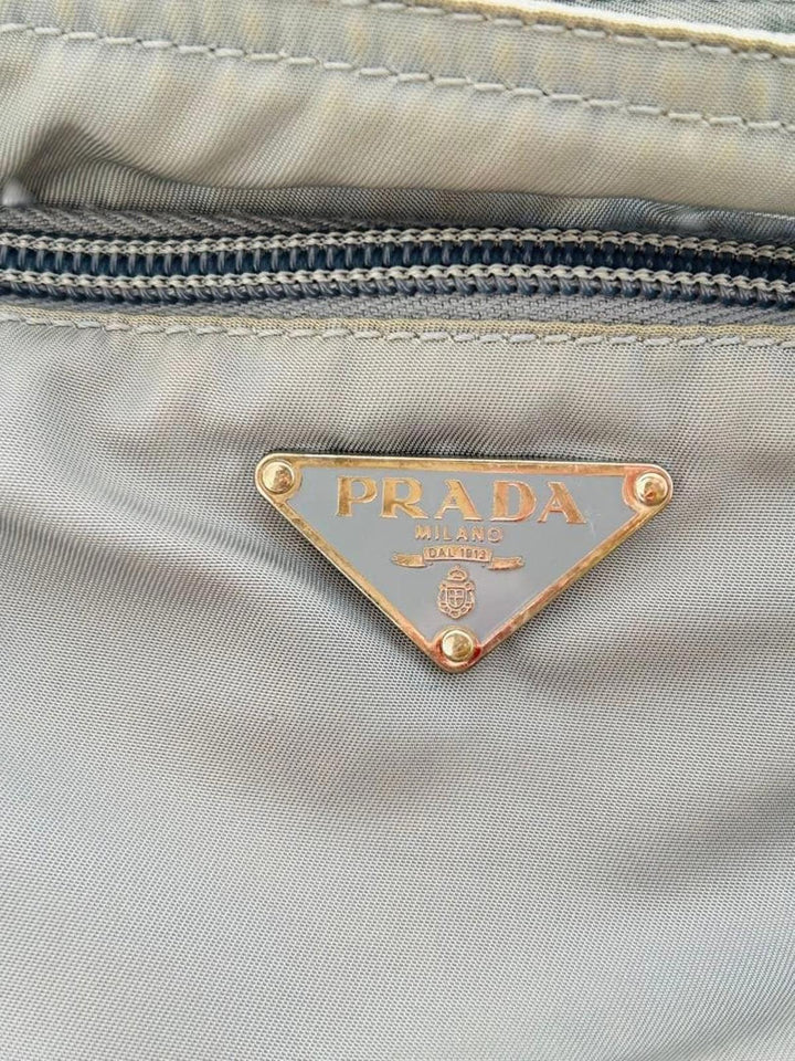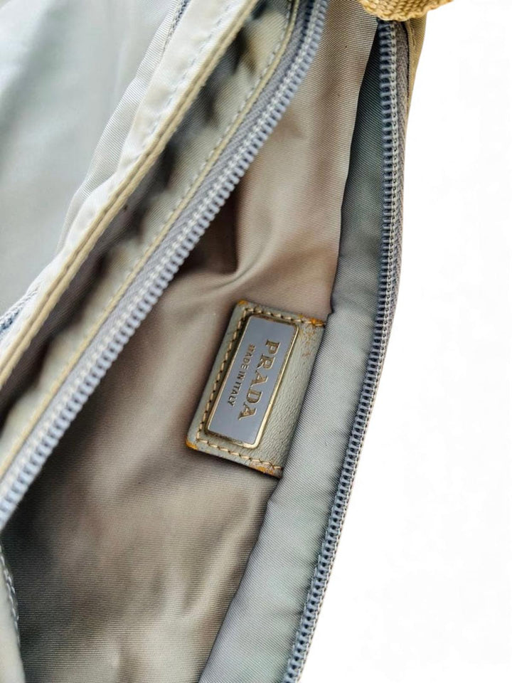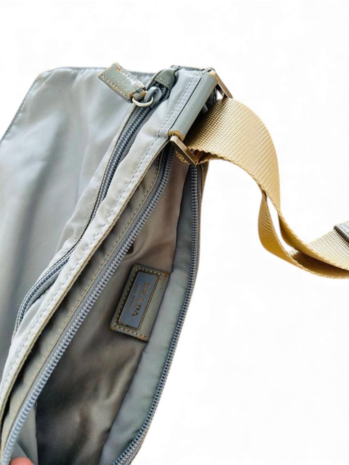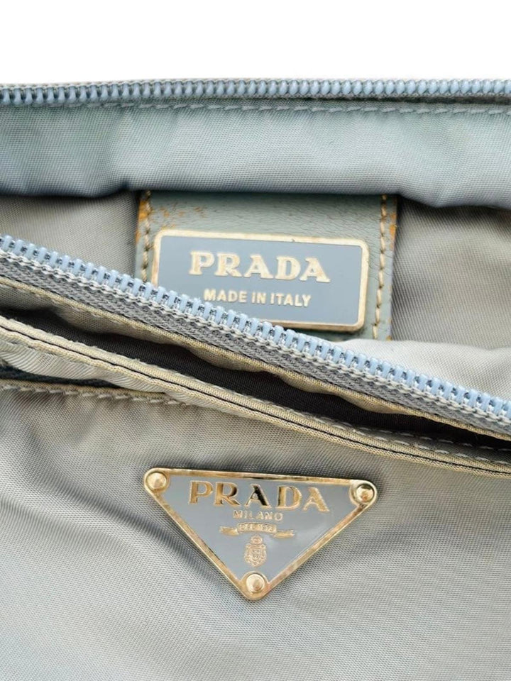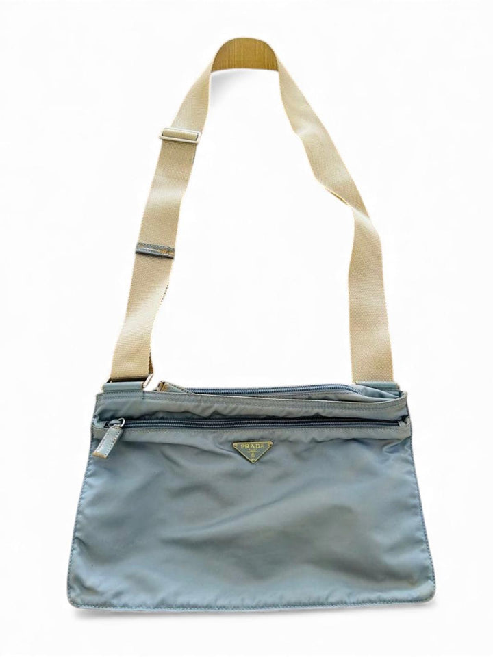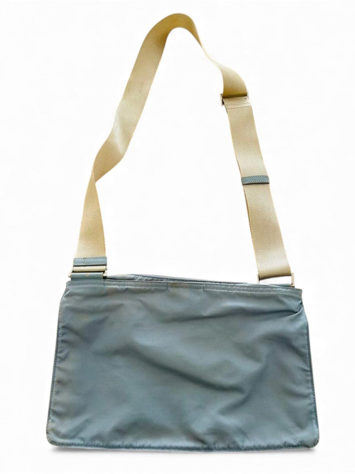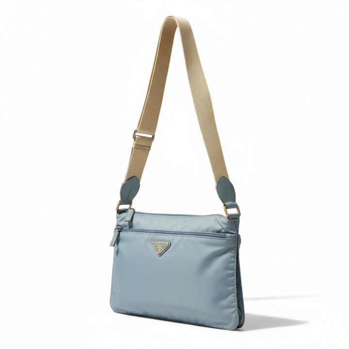 This Prada shoulder bag features a sleek light blue nylon body with a contrasting beige adjustable strap, ideal for comfortable everyday wear. It includes multiple zippered compartments for secure storage and easy organisation.