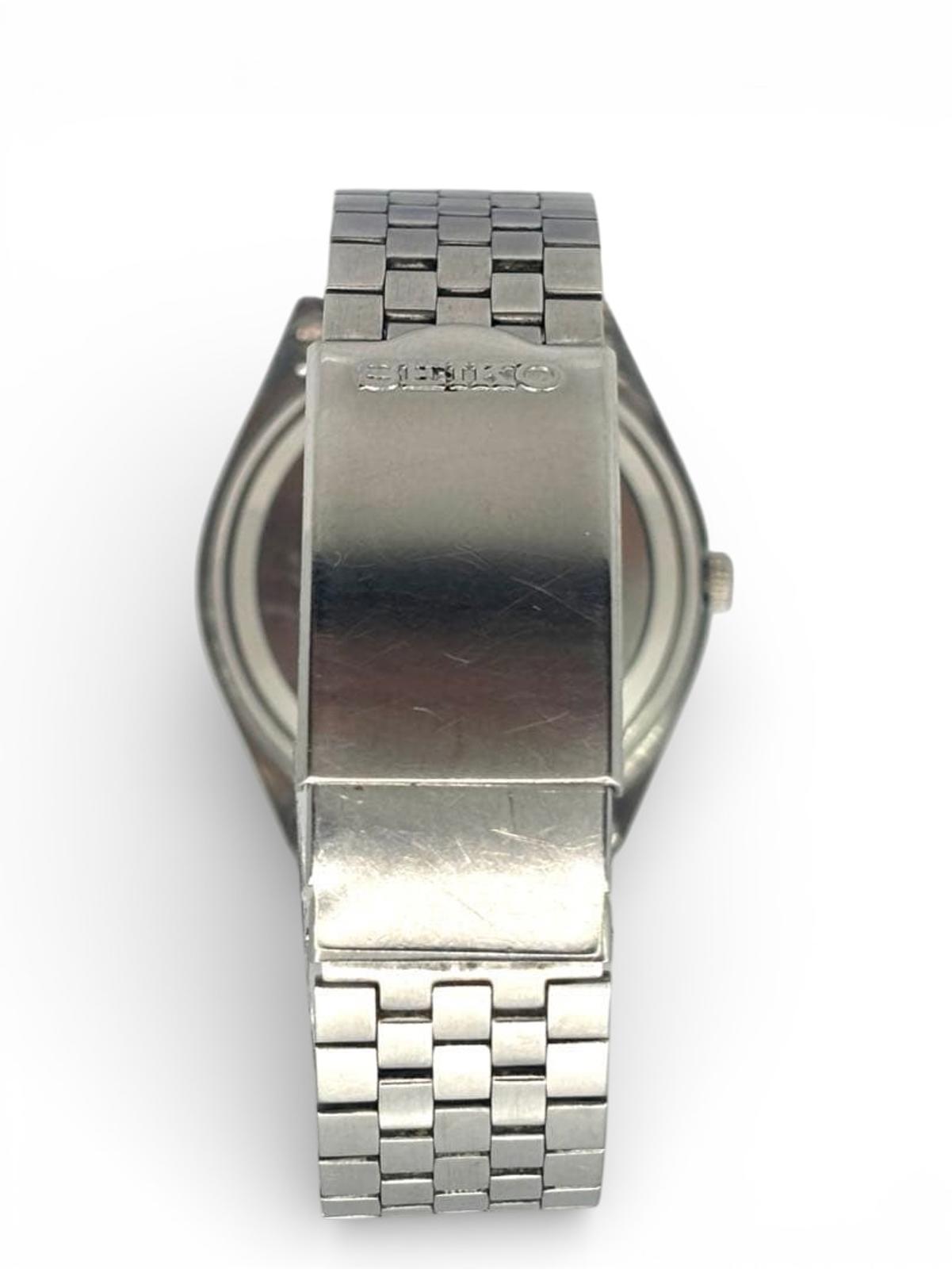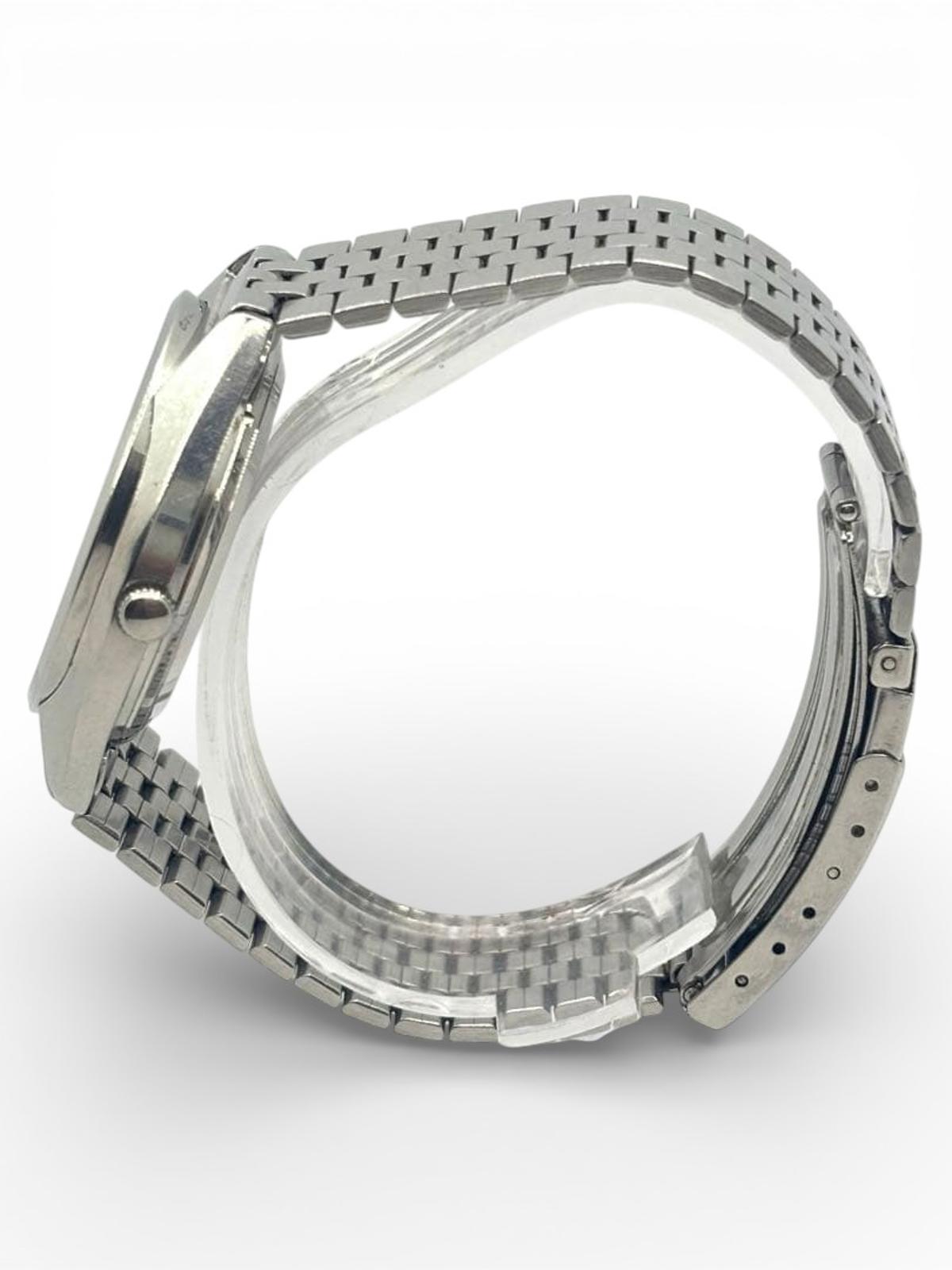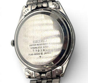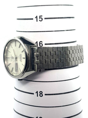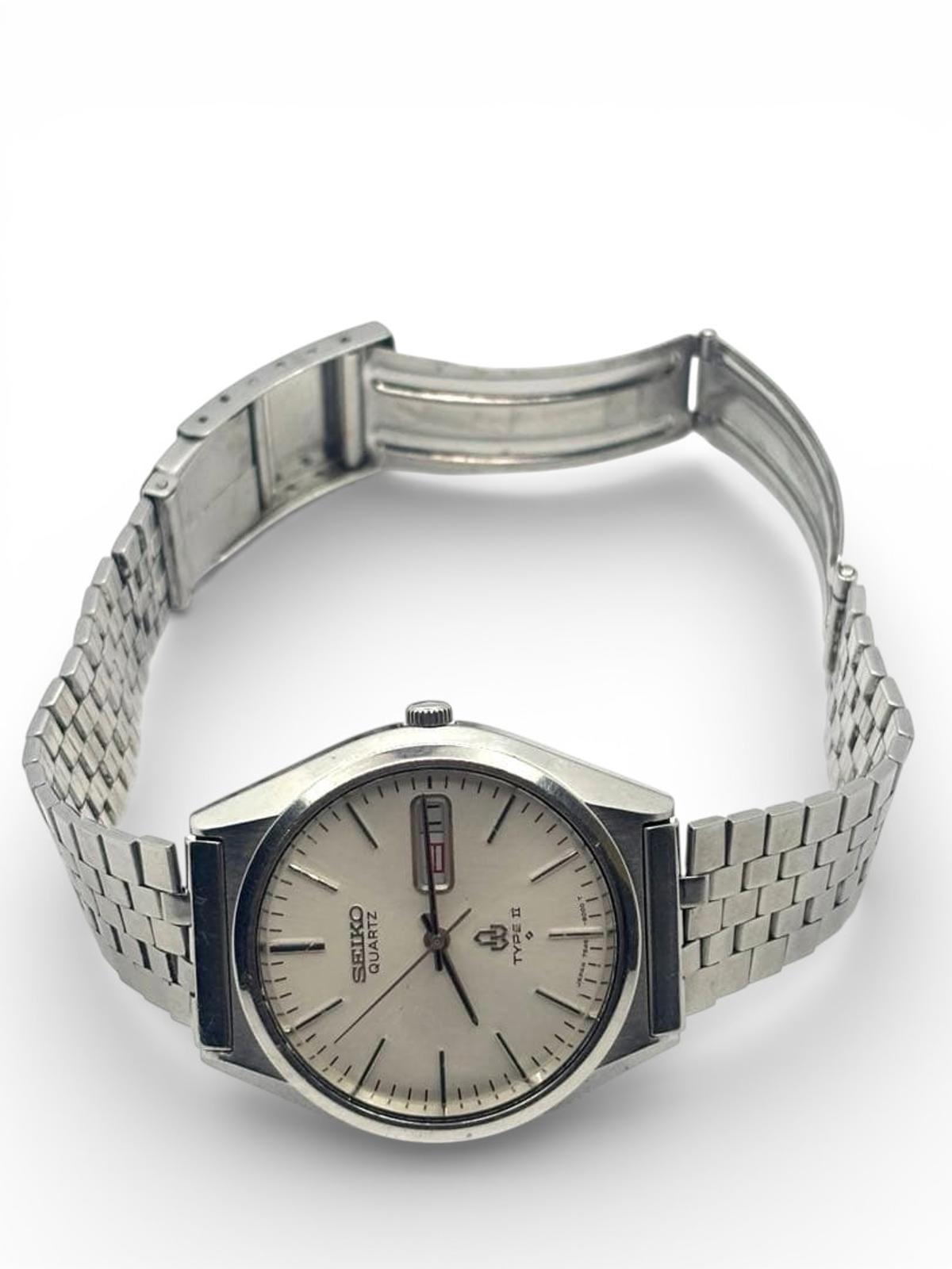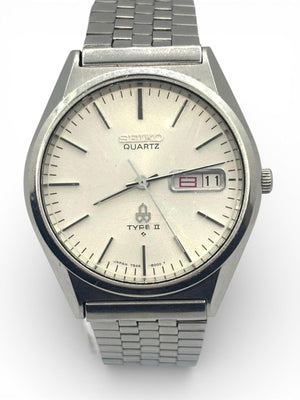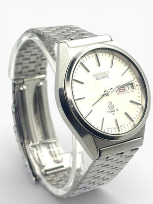 This Seiko Quartz Type II men's watch features a classic stainless steel case and bracelet. It includes a clear white dial with silver-tone hands and markers, complemented by a date display window at the 3 o'clock position. The watch is designed for everyday wear, combining style and functionality.