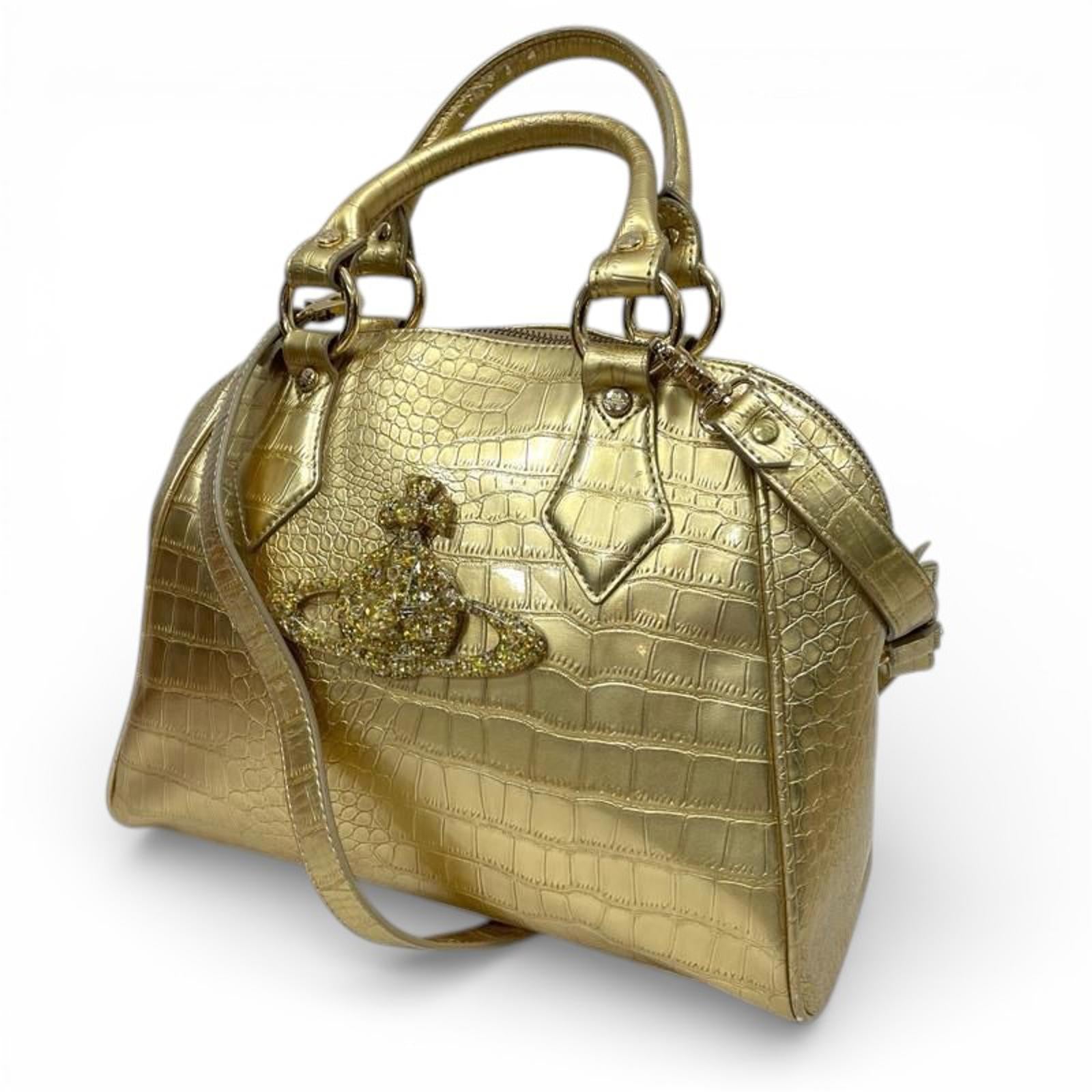 This Vivienne Westwood handbag features a gold croc-embossed leather exterior with a structured silhouette. It has dual top handles and an adjustable shoulder strap for versatile carrying options. The iconic Vivienne Westwood orb emblem is prominently displayed on the front, embellished with sparkling stones for added elegance.